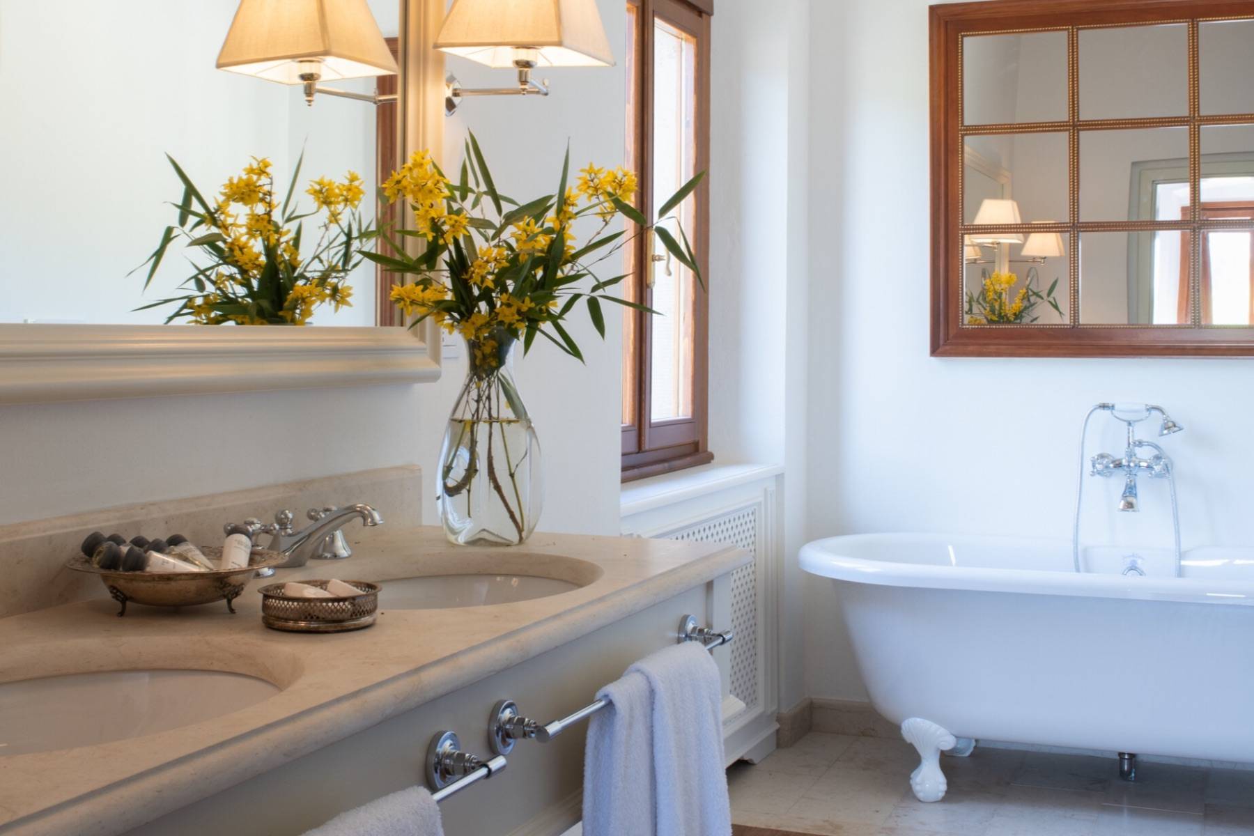 Die Villa wurde sorgfältig renoviert, wobei klassische und moderne Elemente miteinander kombiniert wurden. Die Einrichtung des Anwesens ist tadellos, luxuriös und komfortabel. Die weichen Pastellfarben der Polster und Vorhänge vermitteln Frische und Harmonie.
