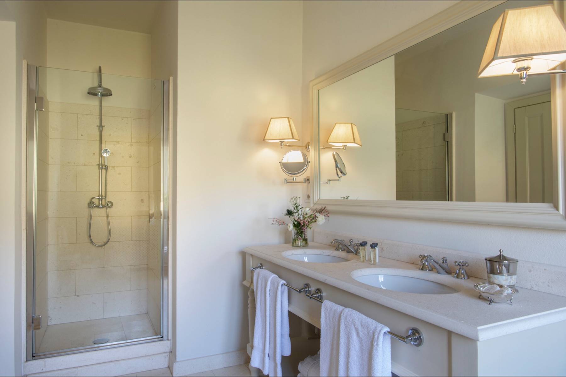 Im Erdgeschoss befinden sich ein großes Wohnzimmer, eine voll ausgestattete offene Küche, und ein helles Esszimmer mit zwei Bogentüren zum Garten hin. Ein Hauptschlafzimmer mit Doppelbett und eigenem Bad befindet sich ebenfalls auf dieser Etage. Drei weitere Schlafzimmer befinden sich im Obergeschoss - alle drei mit eigenem Bad. Im Dachgeschoss befindet sich ein sehr romantisches Zimmer mit einem atemberaubenden Blick auf das Anwesen und ebenfalls eigenem Badezimmer.
