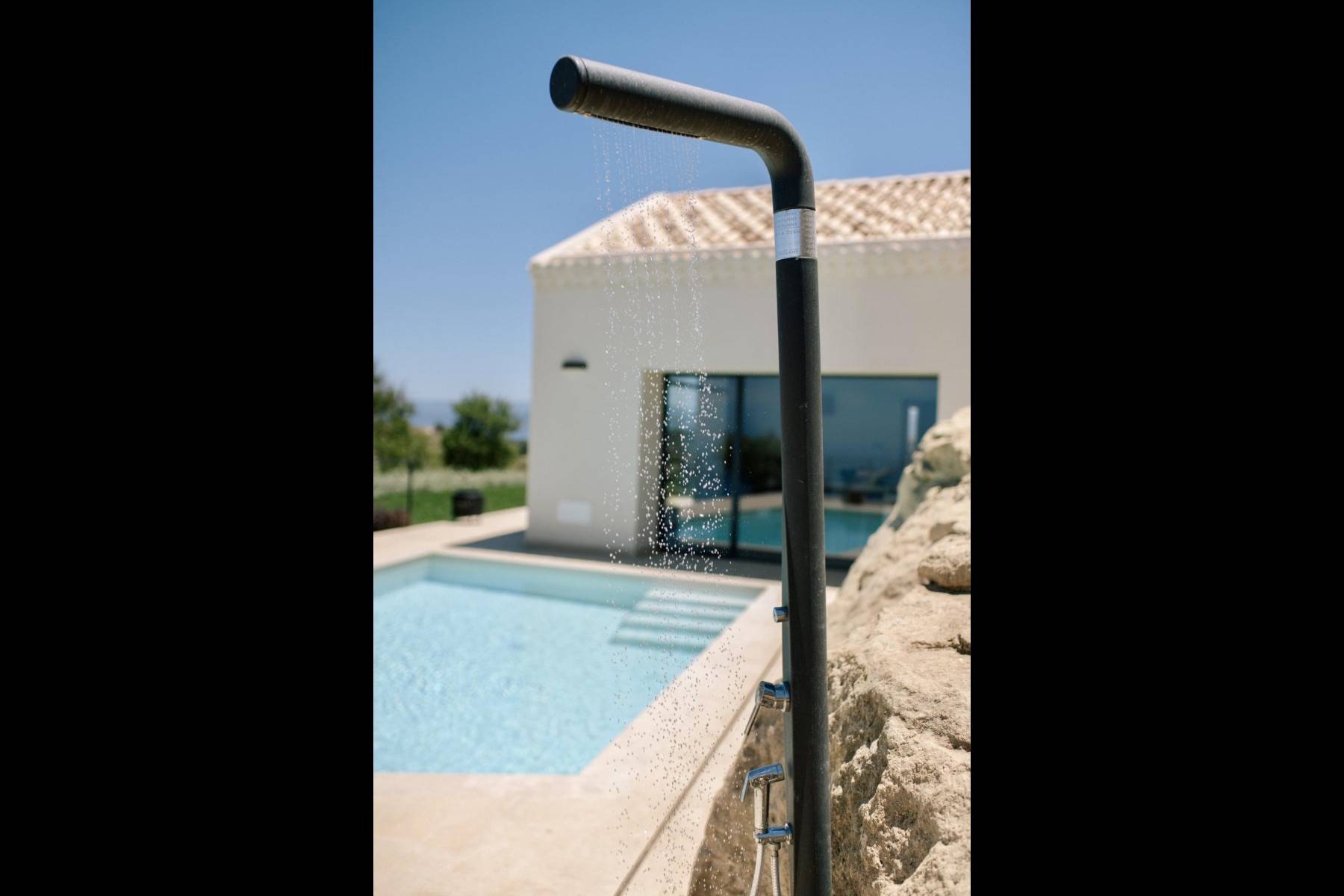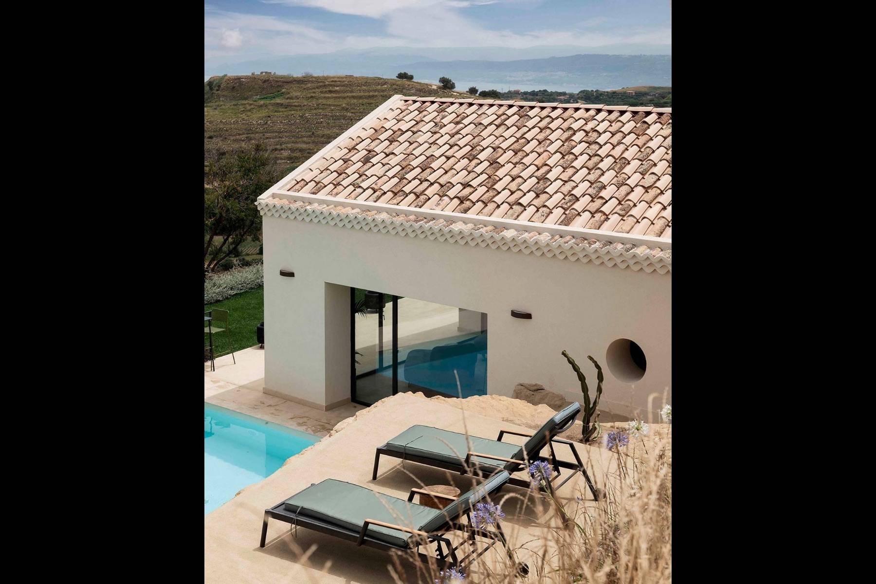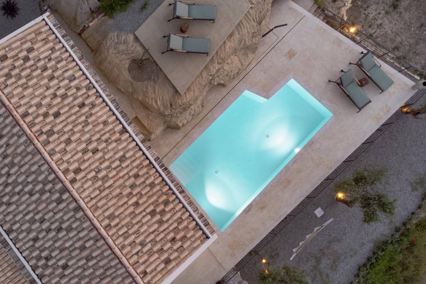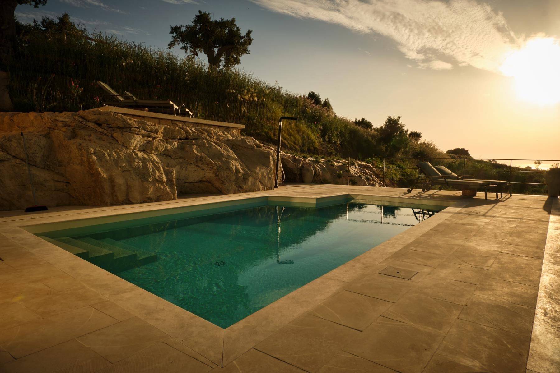 Im Aussenbereich ein beheizbarer Infinity-Pool aus Tuffstein, der von lokalen Handwerkern in den Hügel gehauen wurde. Bedienen Sie sich am Bio-Gemüse-Obstgarten, machen Sie ein Nickerchen in den handgefertigten Hängematten und schlendern Sie über einen Fußweg durch die Felder der roten Tropeazwiebel direkt zum Meer.