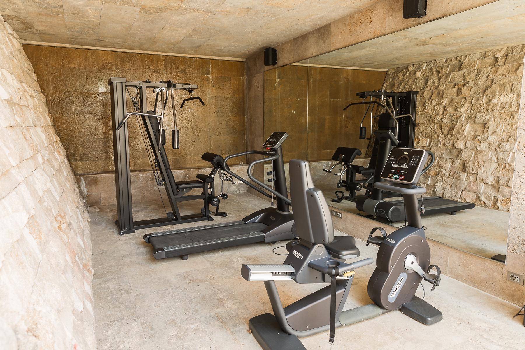 Privater Fitnessbereich mit hochwertigen Geräten, darunter ein stationäres Fahrrad, ein Laufband und eine Trainingsbank.