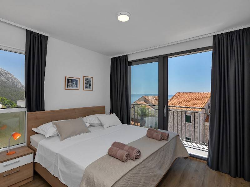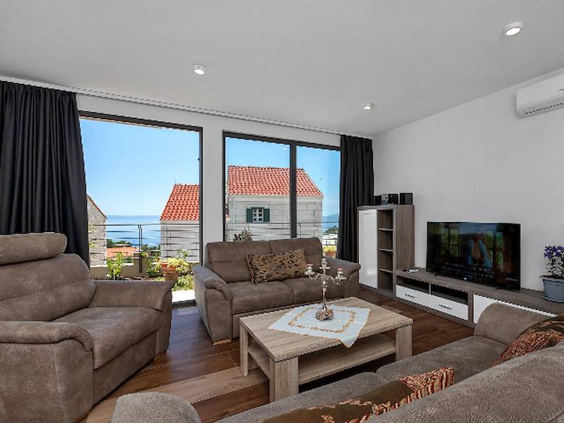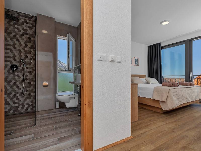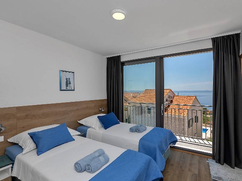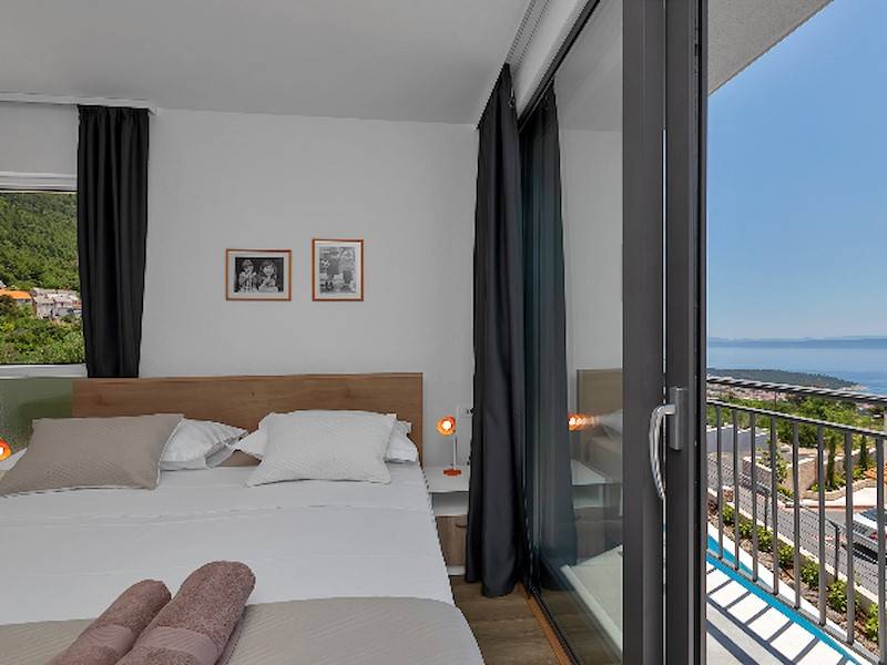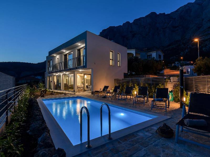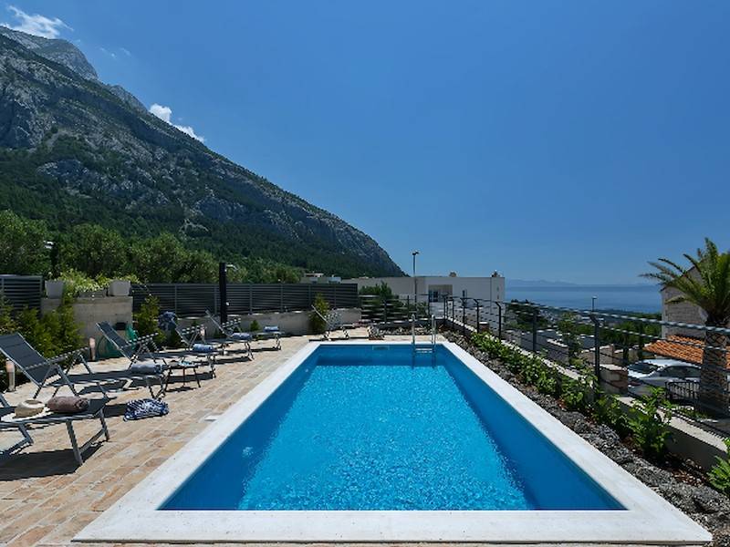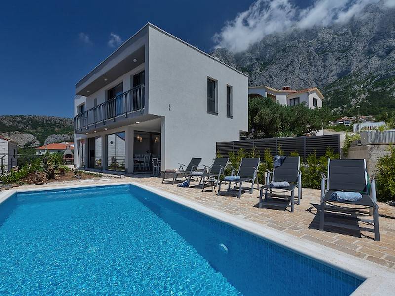 Modernes Ferienhaus mit Pool und Meerblick oberhalb der Stadt Makarska. Schöne Terrasse mit Pool und Sonnenliegen, Aussendusche, Meerblick und Grillstelle. Im Haus befinden sich insgesamt drei Schalfzimmer, zwei davon mit Doppelbett, eines mit zwei Einzelbetten die auch zusammengestellt werden können, jedes Zimmer verfügt über eigenes Badezimmer (enSuite) mit Dusche.Alle Zimmer sind mit SAT/TV und Klimaanlage ausgestatett. WiFi(WLAN) vorhanden.