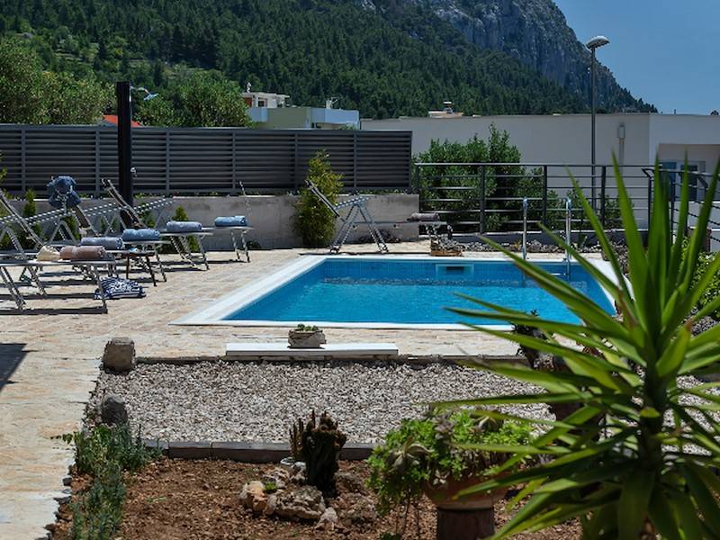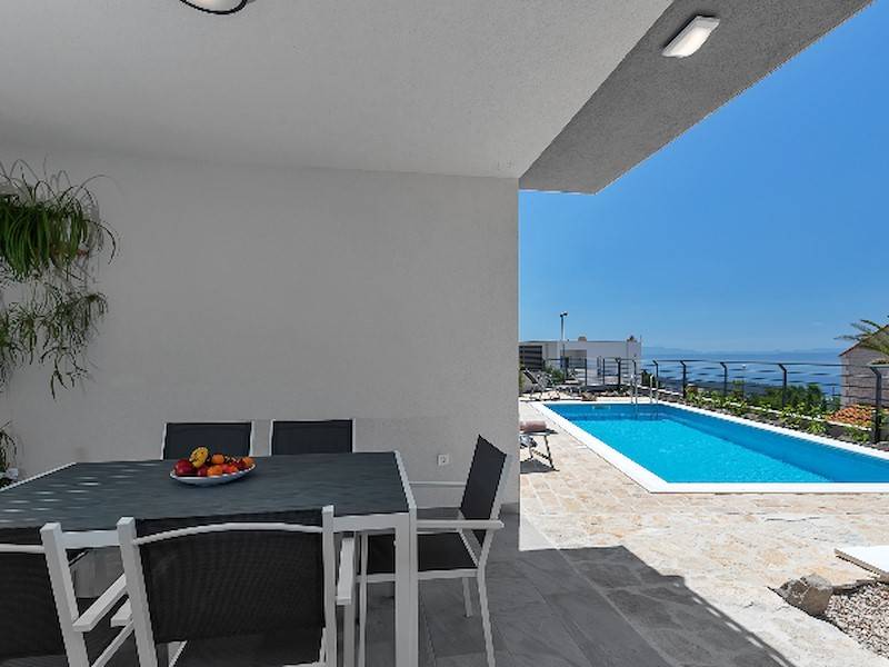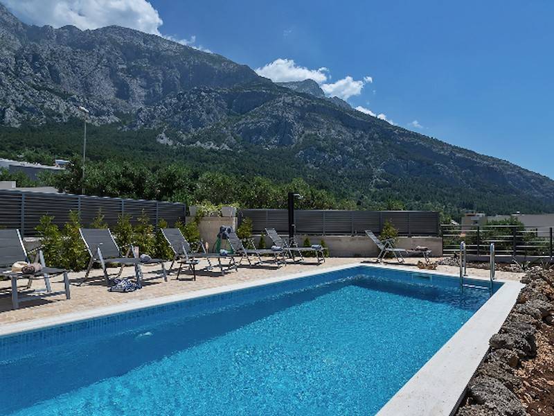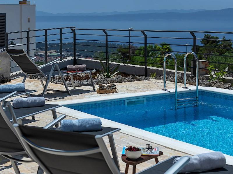 Moderne Ferienhaus mit Pool, Meerblick, drei Schlafzimmer, oberhalb der Stadt Makarska. Terrasse mit Pool, Sonnenliegen, Aussendusch und Grillstelle.