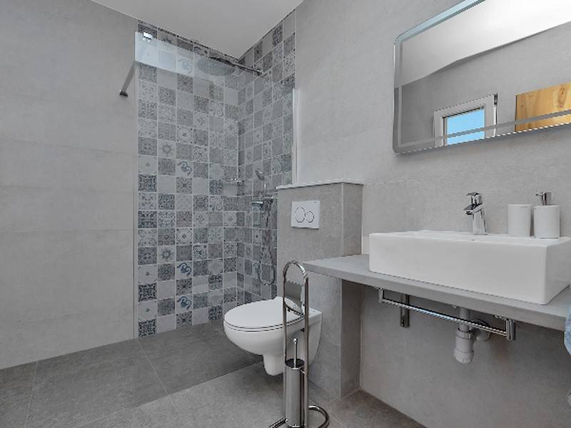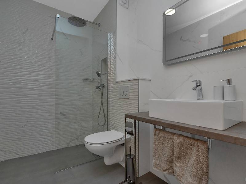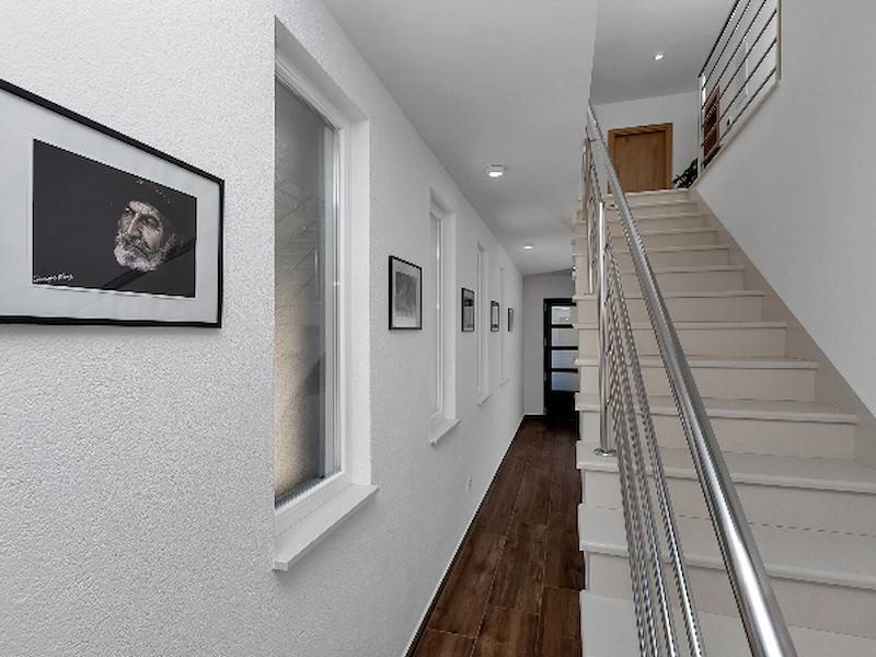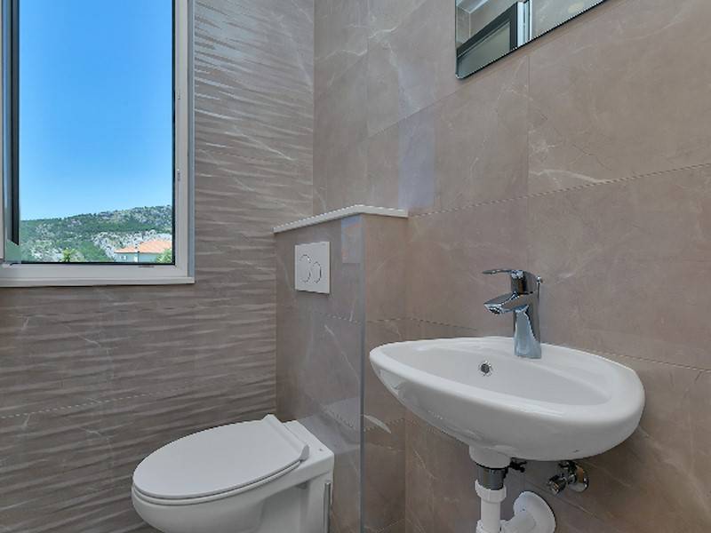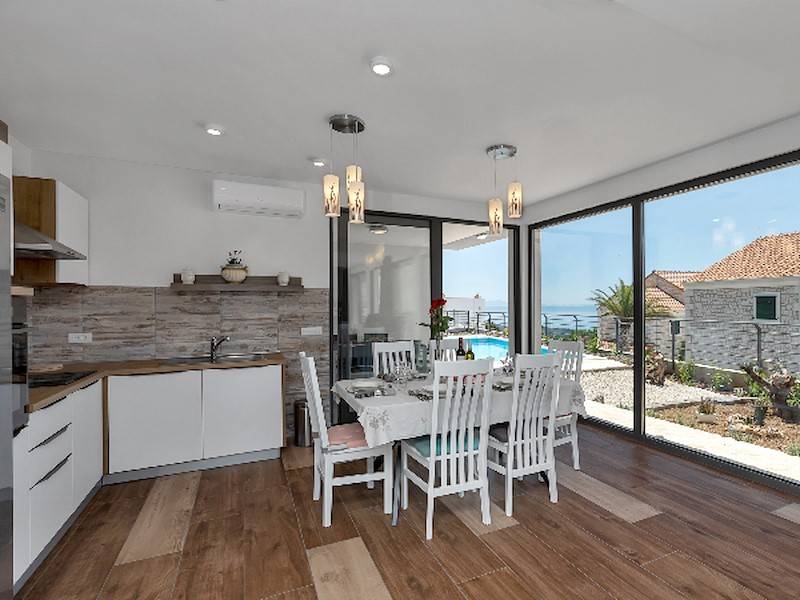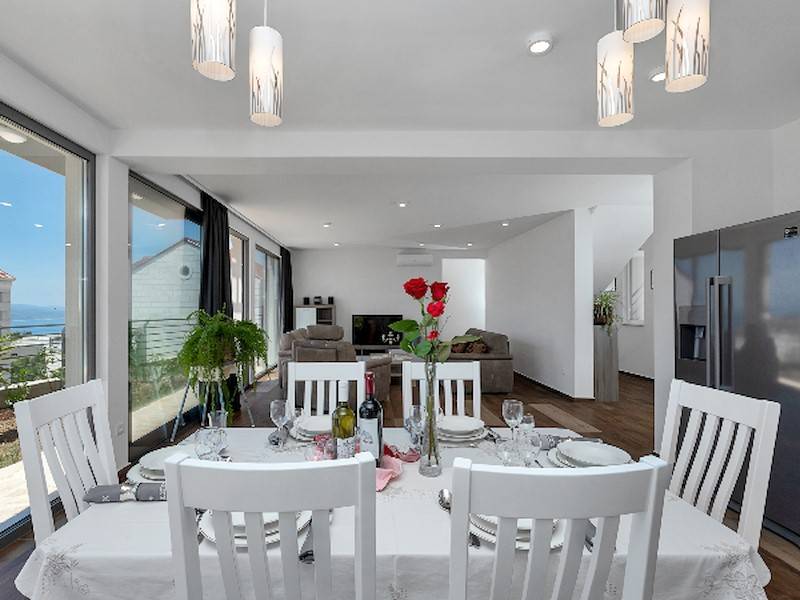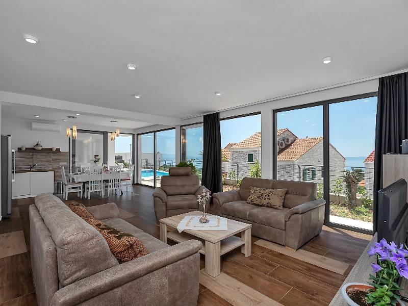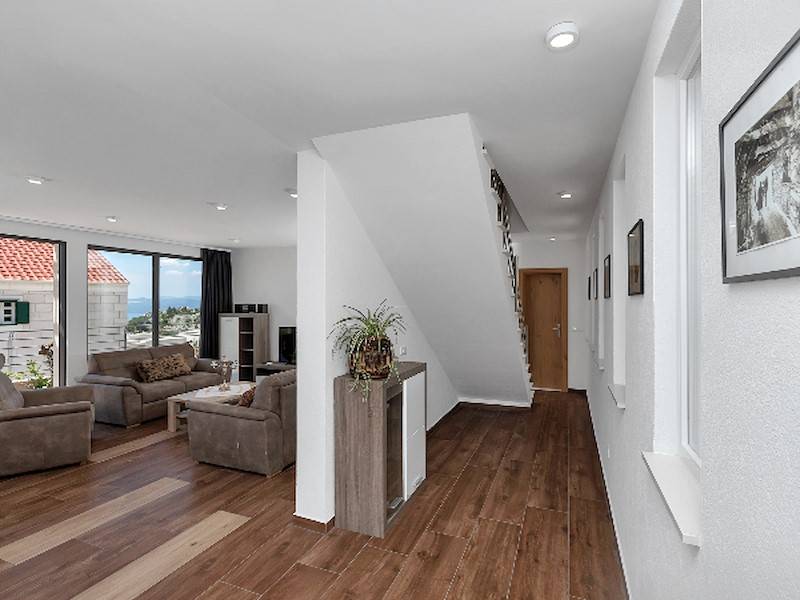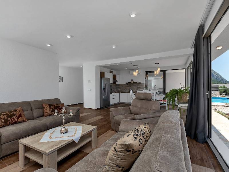 Im Erdgeschoß befindet sich das gerämige Wohnzimmer mit offener, komplett ausgestatetten Küche mit Ausgang auf die Terrasse mit Pool. Das Ferienhaus ist ganz neu, hell und modern eingerichtet. Ideal für einen Familienurlaub in Makarska. Parkplätze im Hof.