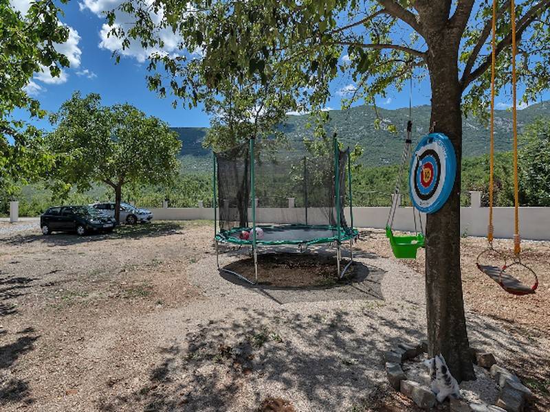 Alleinstehendes Ferienhaus Villa Danny mit drei Schlafzimmer, beheiztem Pool mit Sonnenliegen und Außendusche, Kinderspielplatz, Trampolin und Bocciaplatz. Ideal für Familien mit Kindern. Gerade 30 Minuten Fahrt von den Stränden der Makarska Riviera entfernt. Hier haben Sie absolute Privatsphere und Ruhe. Das Ferienhaus ist sehr modern eingerichtet.