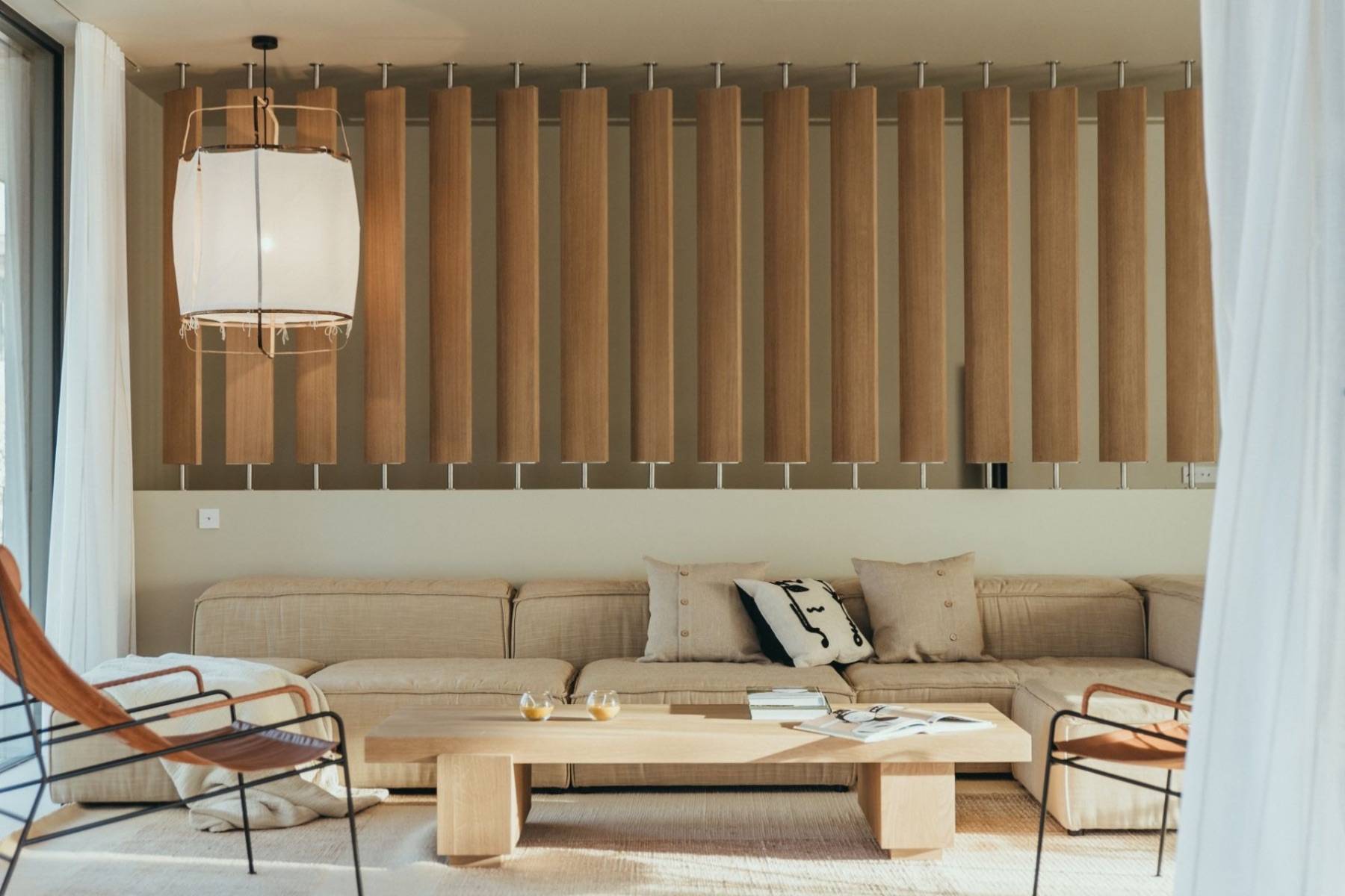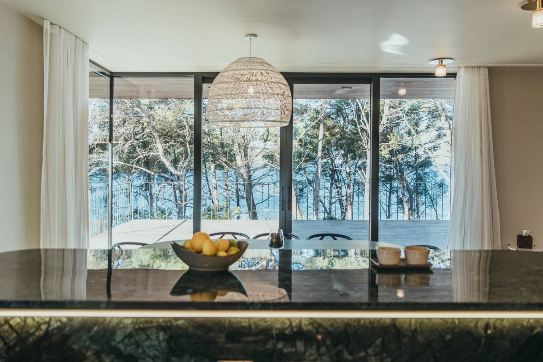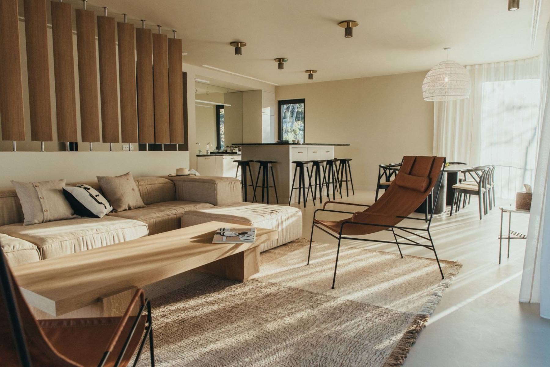 Der großzügige Wohn- und Essbereich geht offen ineinander über. Eine große Luxusküche mit einer Küchentheke ist inmitten des Raumes platziert und ermöglicht auch einen Blick auf das Meer. Die minimalistische Einrichtung in dezenten Erdtönen ist hochwertig und gemütlich und untermauert das edle Ambiente dieser Villa.