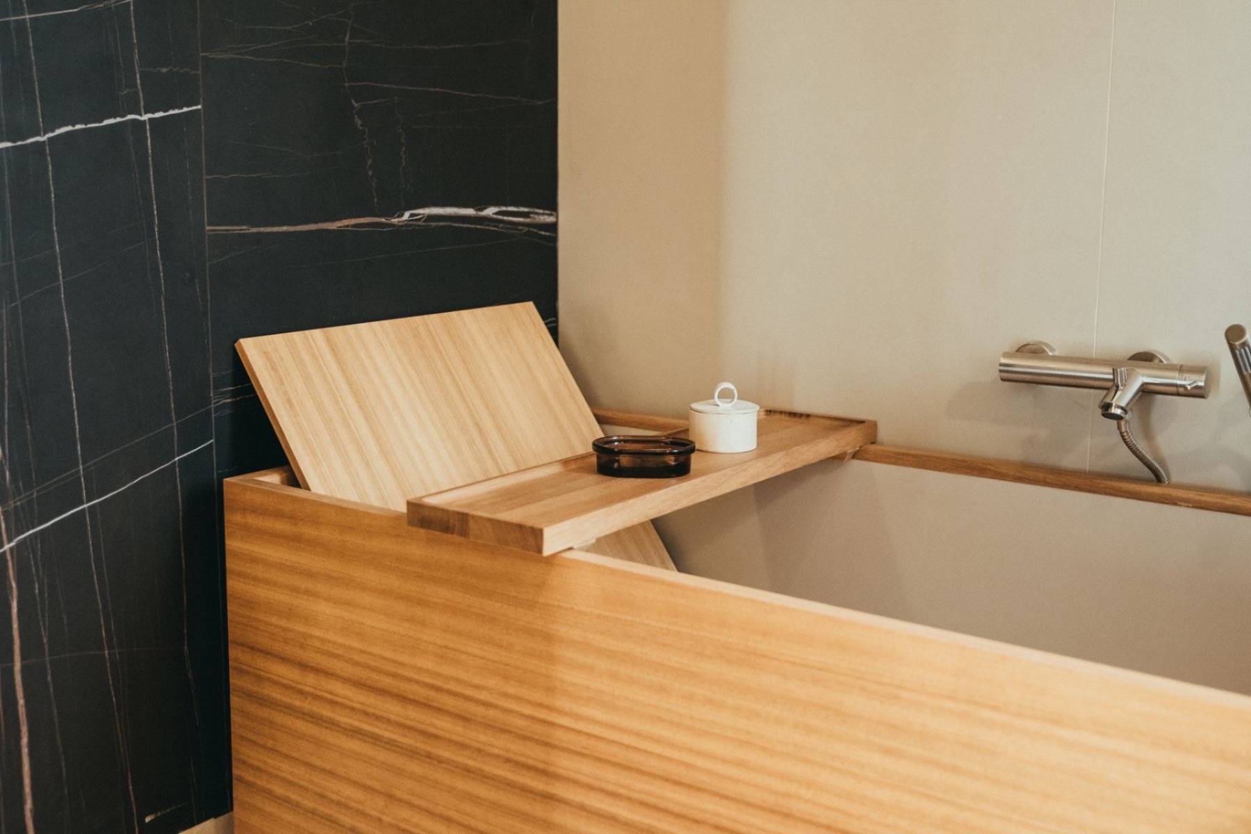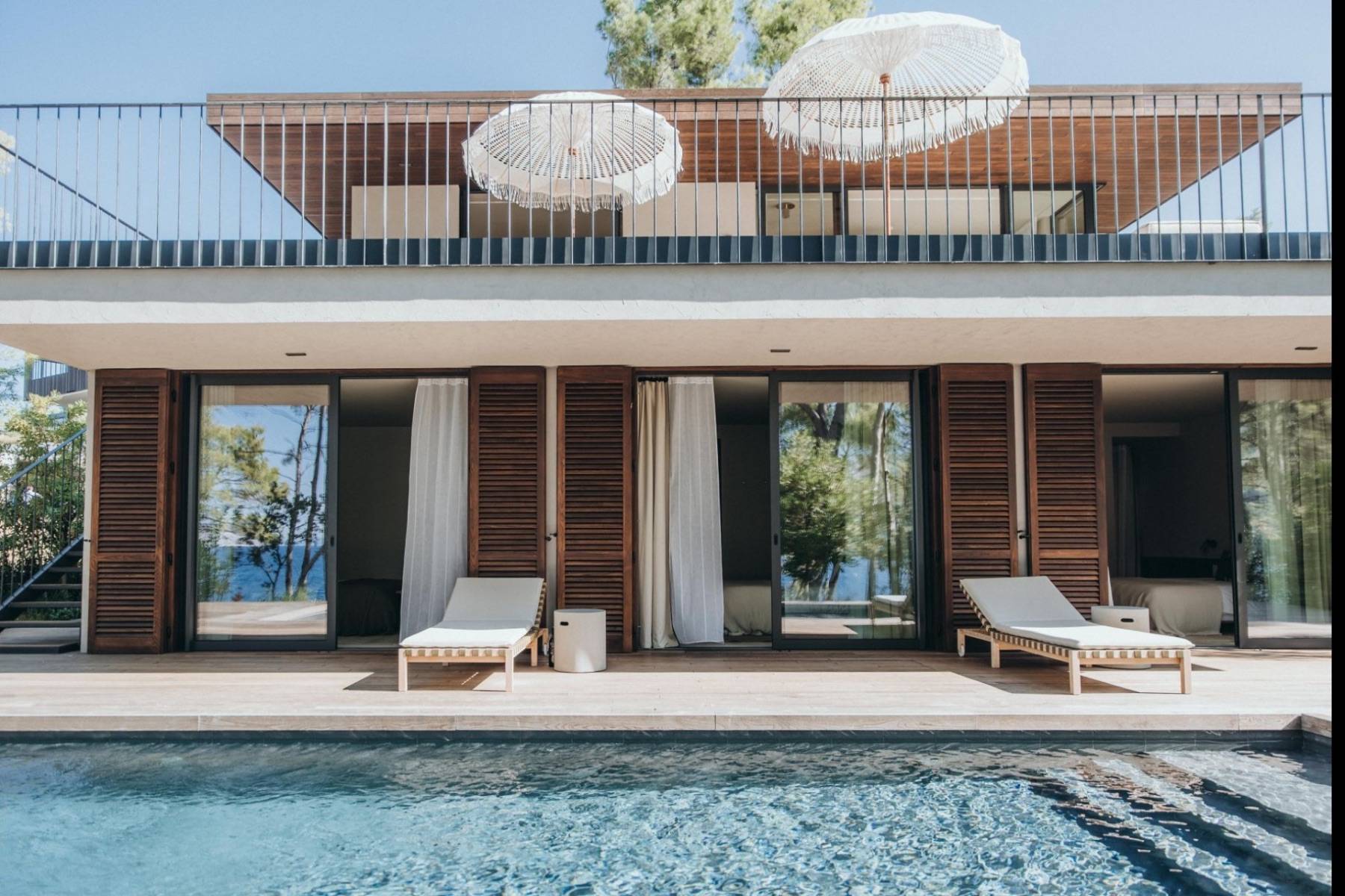 Auf der weitläufigen Holzterrasse erwartet Sie ein großer, beheizter Pool mit Blick auf die Bucht und das Meer.