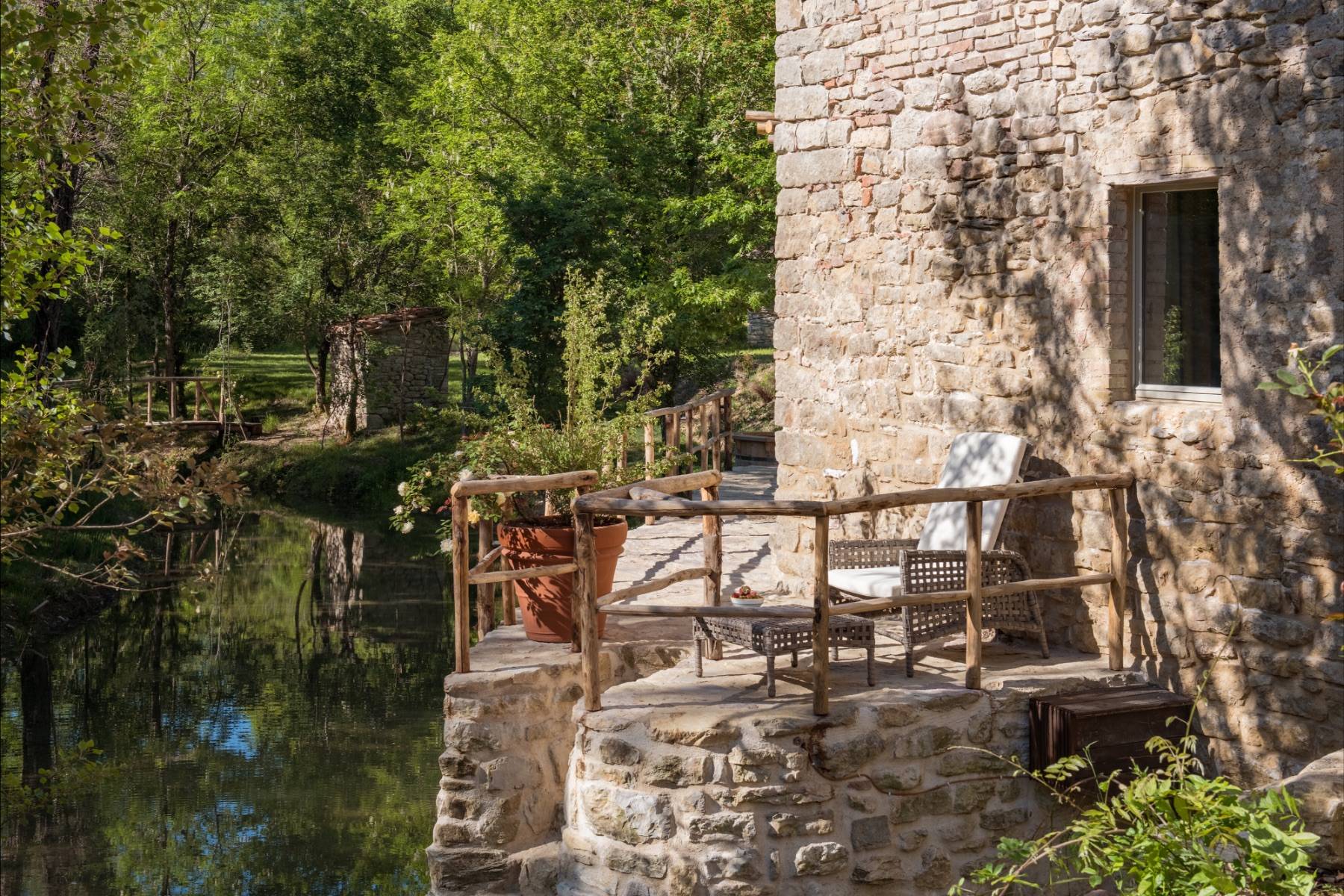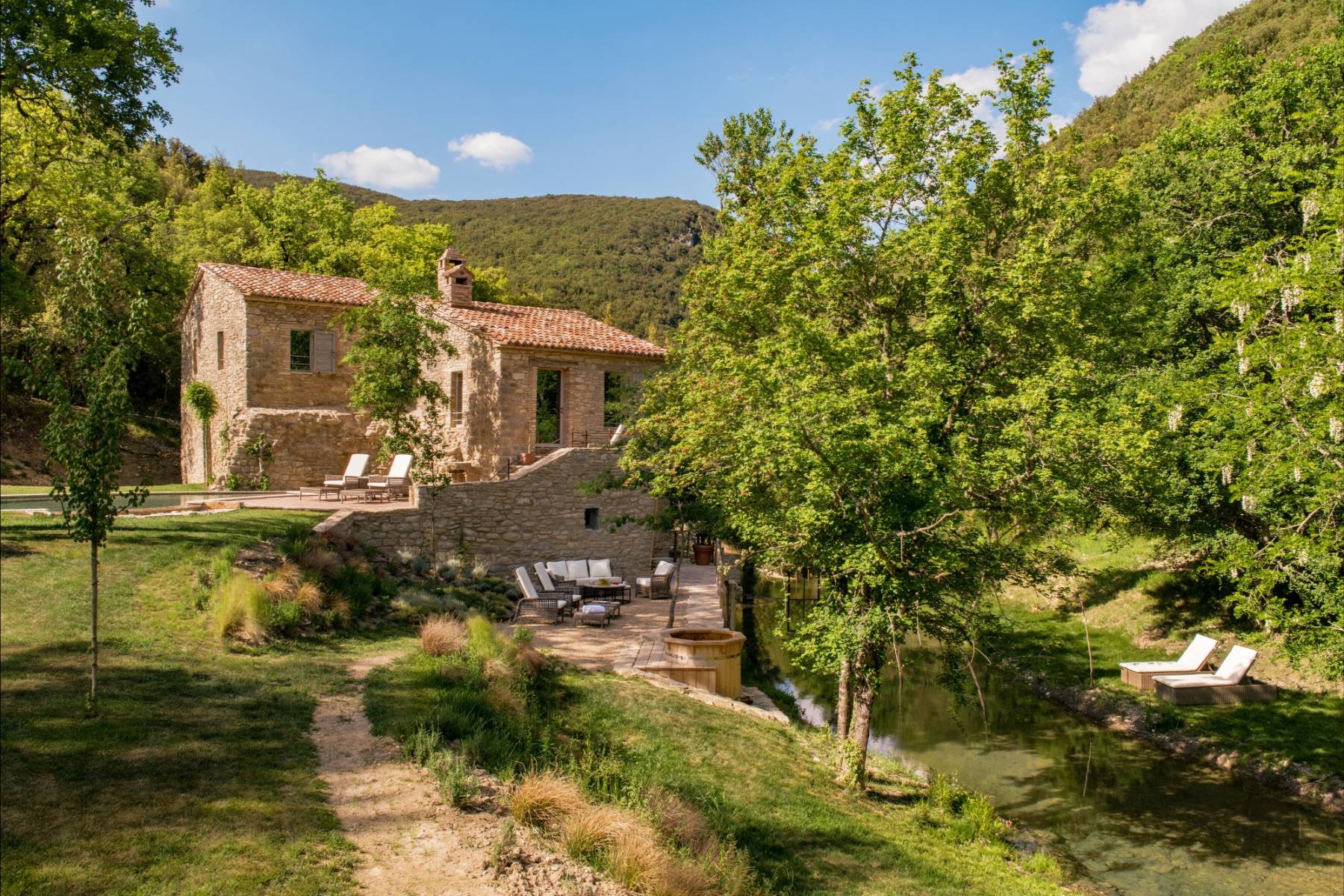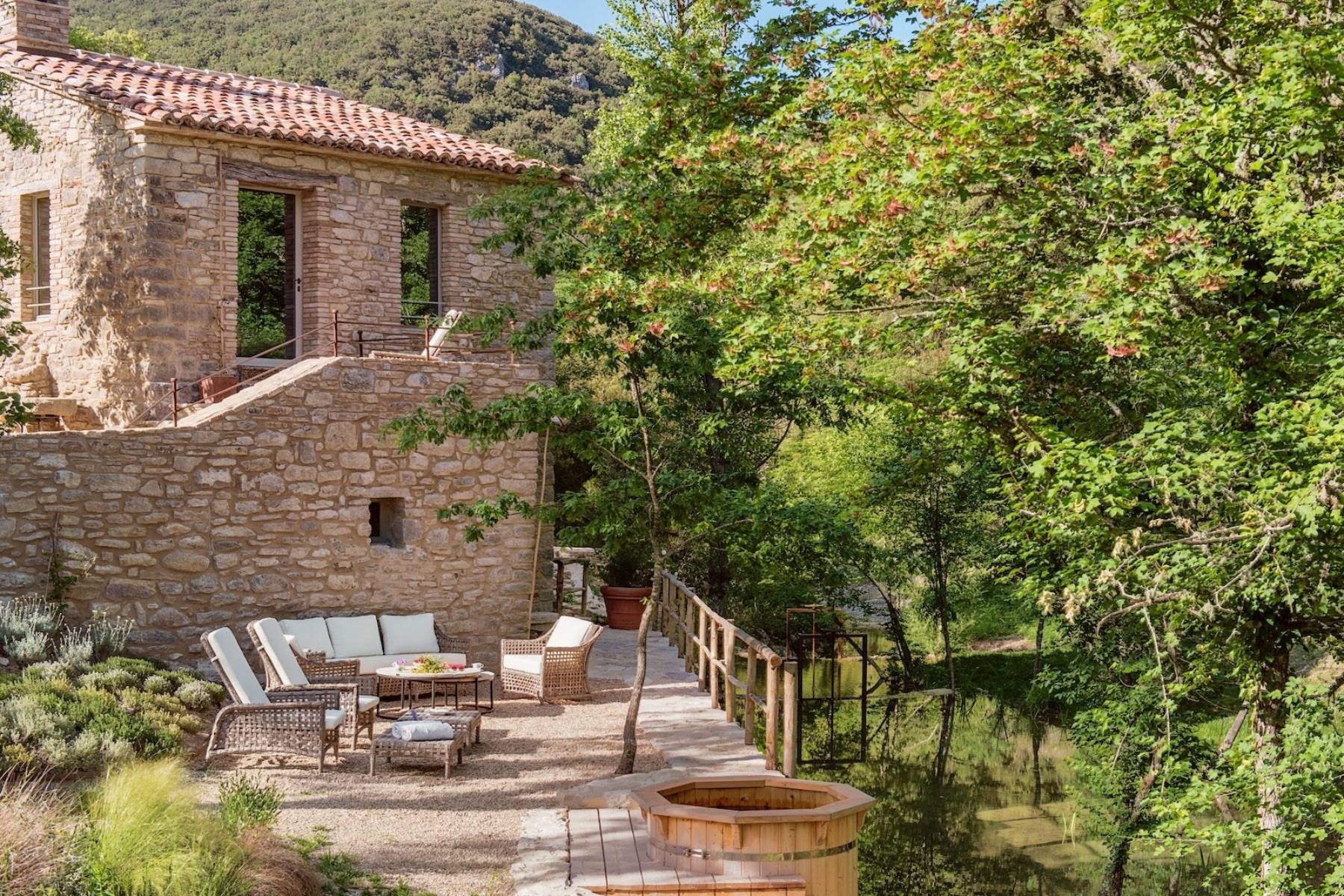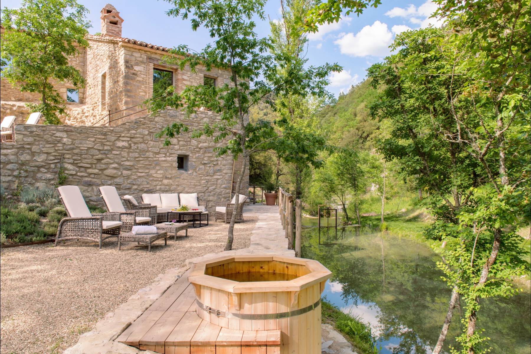 Als Gast können Sie sich hier in der Morgensonne sonnen, umgeben vom friedlichen Rauschen des Flusses, während sie ihren morgendlichen Espresso genießen. Von hier aus können Sie direkt Spaziergänge unternehmen, um die natürlichen "Pools" in der Nähe zu erkunden, bevor Sie im privaten Whirlpool im alten Gewölbe dieser restaurierten Mühle aus dem 13. Jahrhundert entspannen.