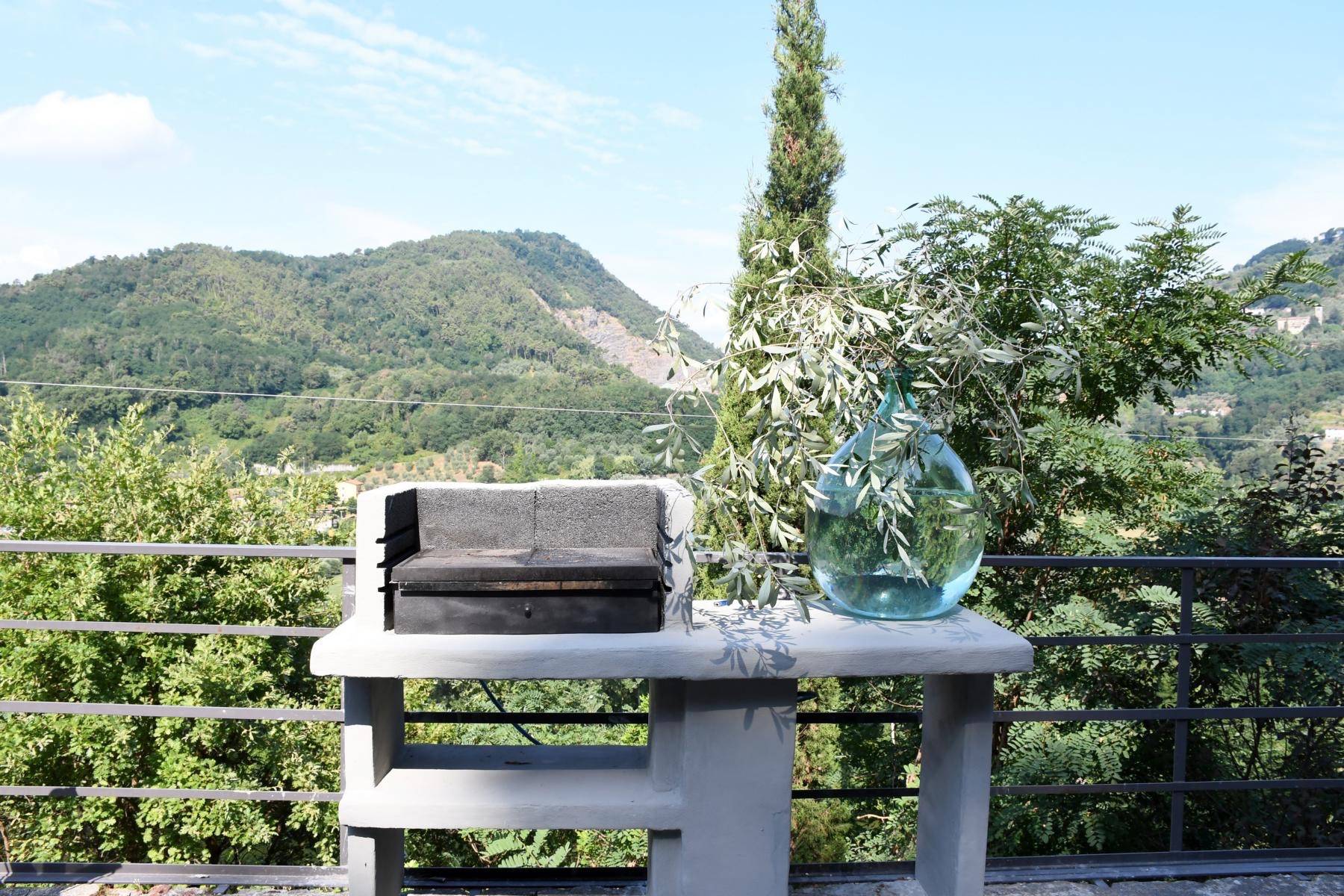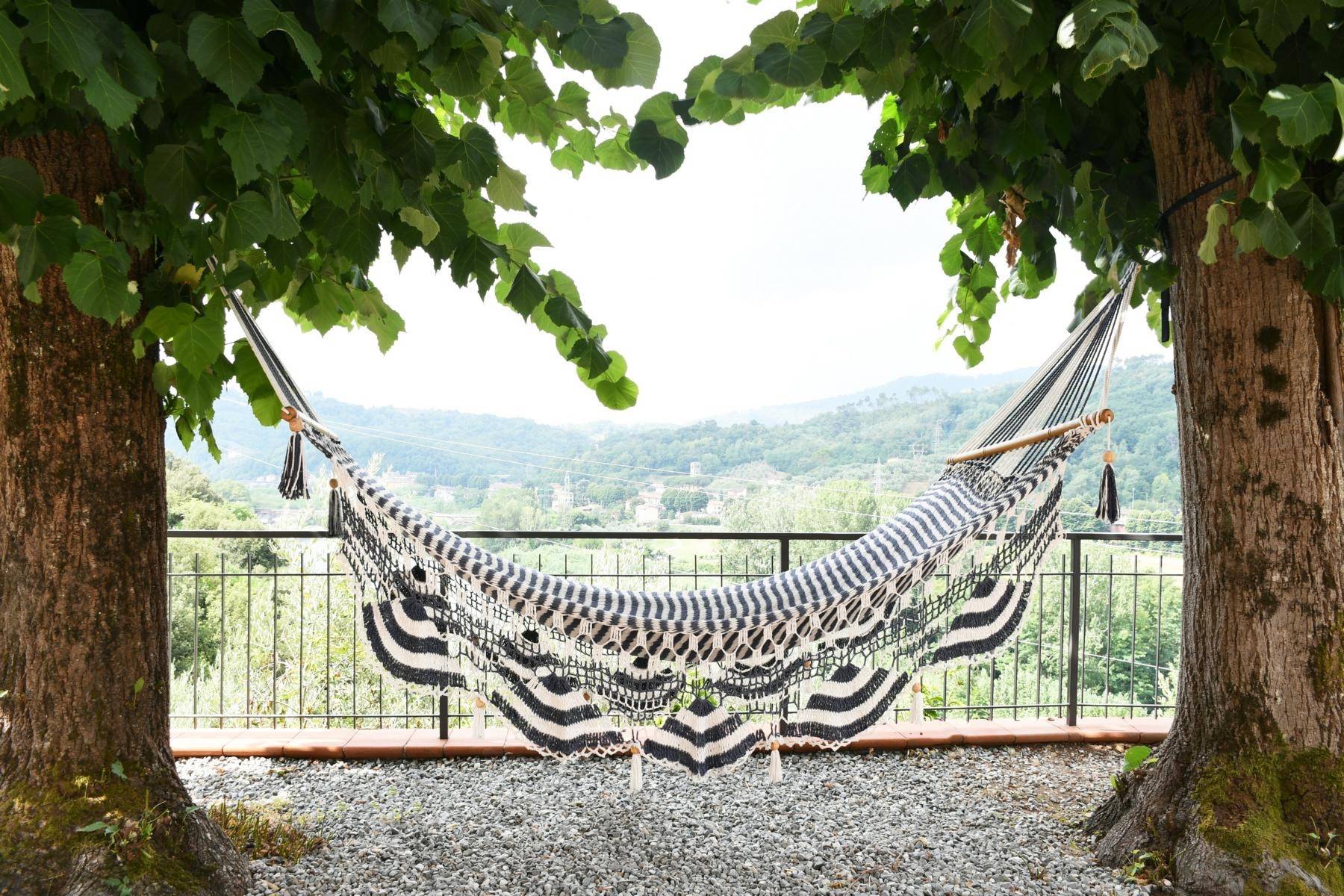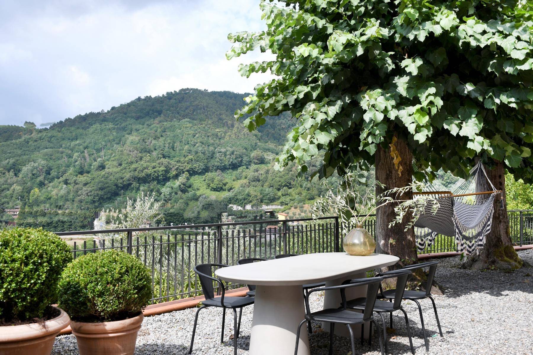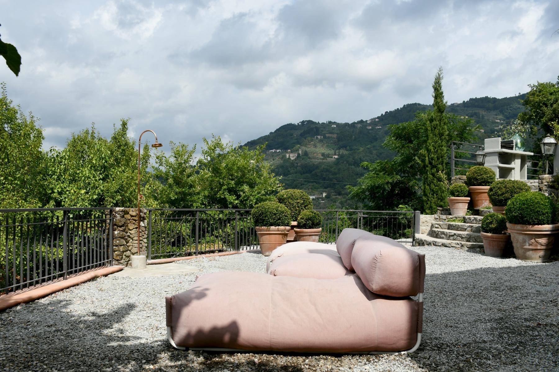 Wunderschön und genauso individuell wie der Innenbereich ist der geschaffene Außenbereich. Dort befinden sich ein Swimmingpool und mehrere Terrassen mit Blick auf den Fluss Serchio, umgeben von einer privaten Waldlandschaft von 2 Hektar Größe.