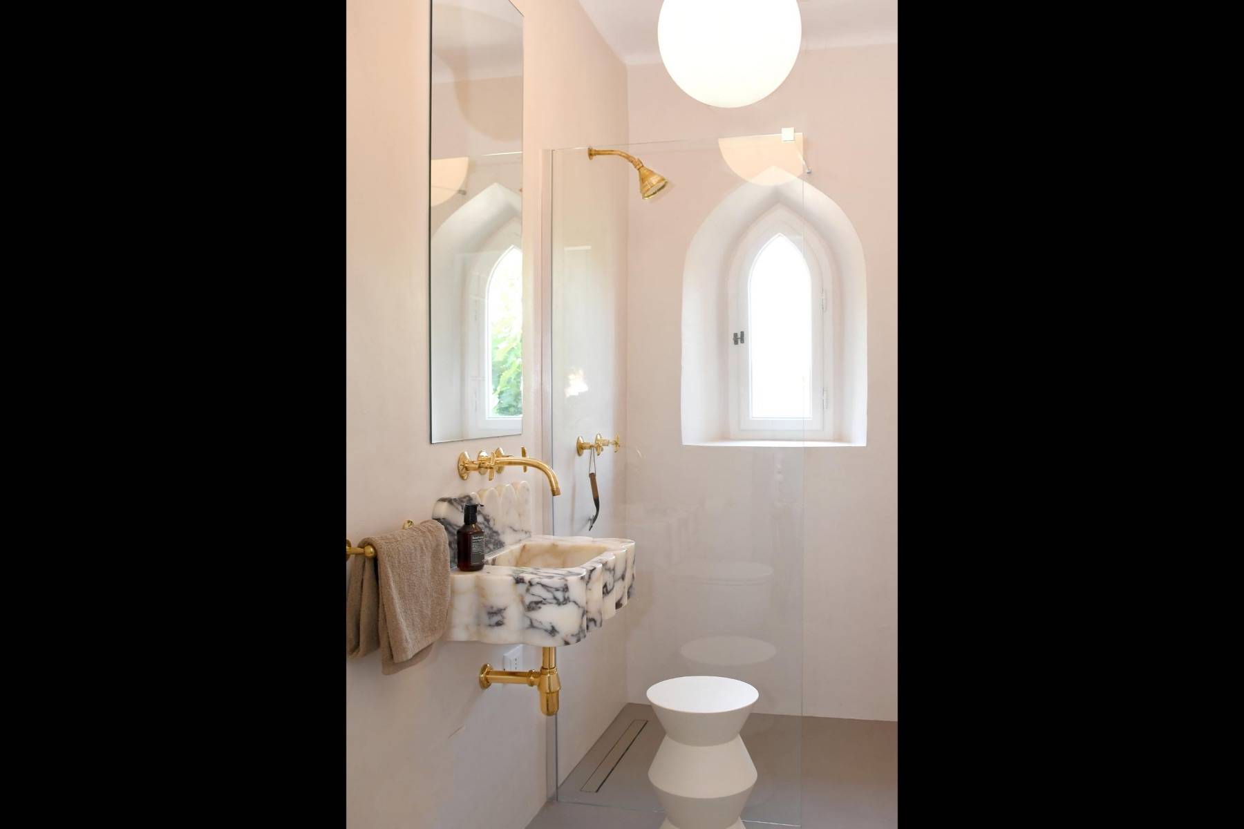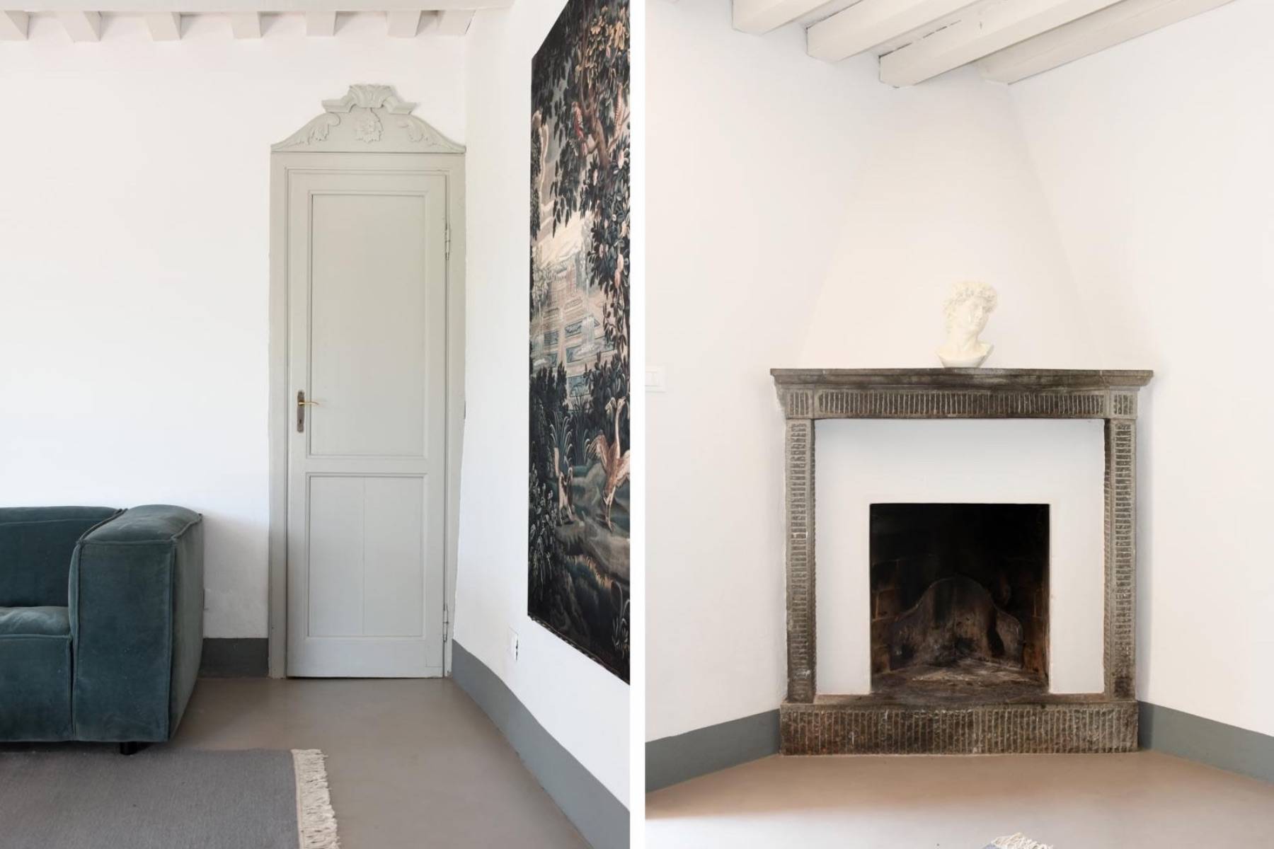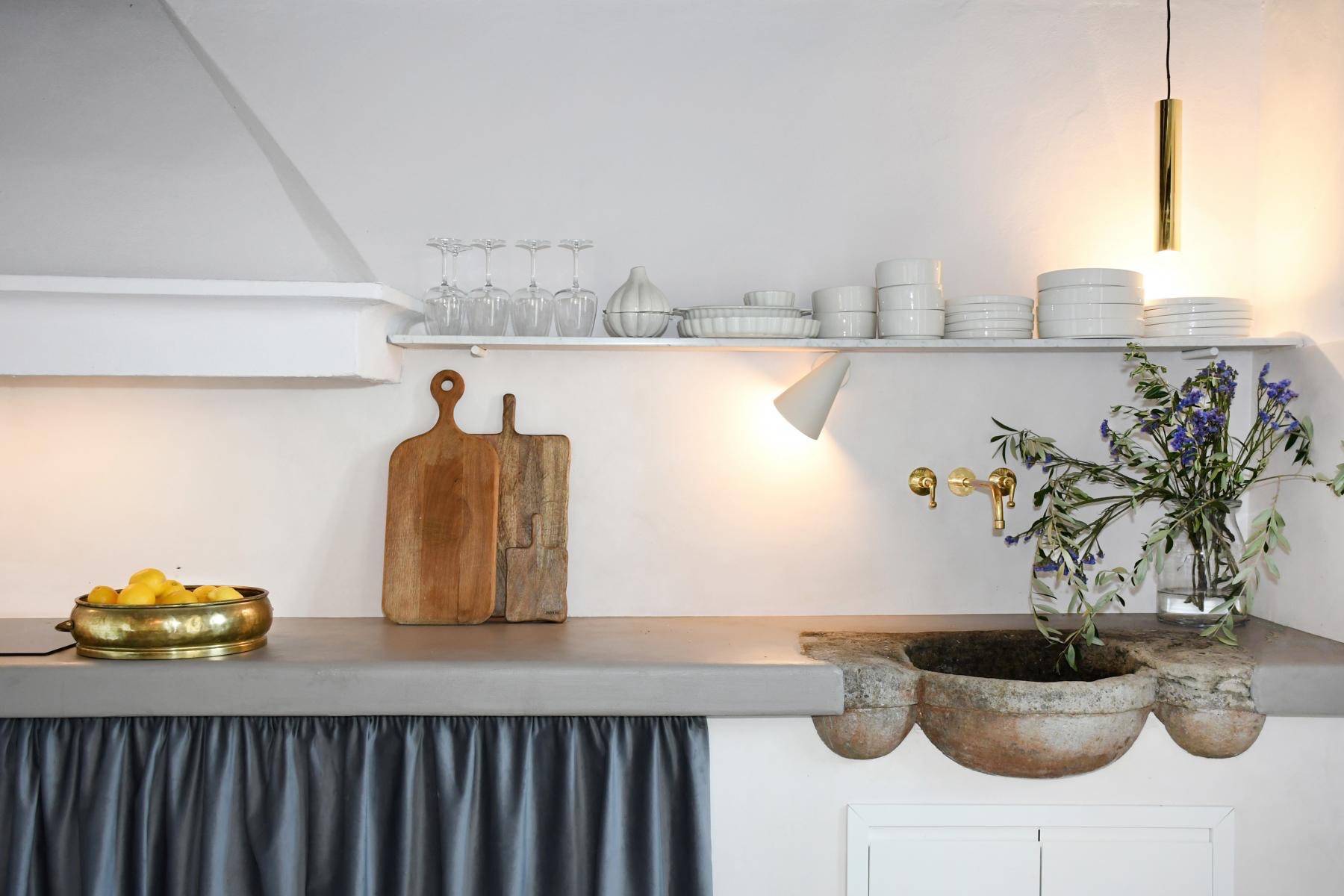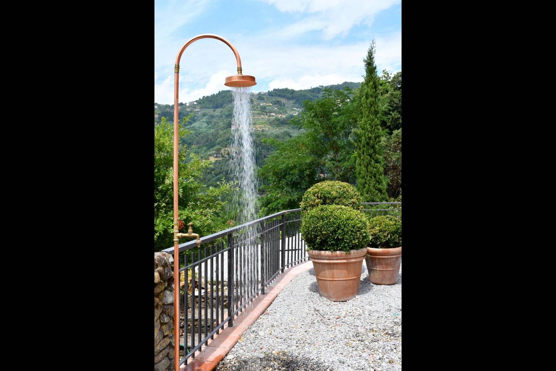 Wunderschön und genauso individuell wie der Innenbereich ist der geschaffene Außenbereich. Dort befinden sich ein Swimmingpool und mehrere Terrassen mit Blick auf den Fluss Serchio, umgeben von einer privaten Waldlandschaft von 2 Hektar Größe.