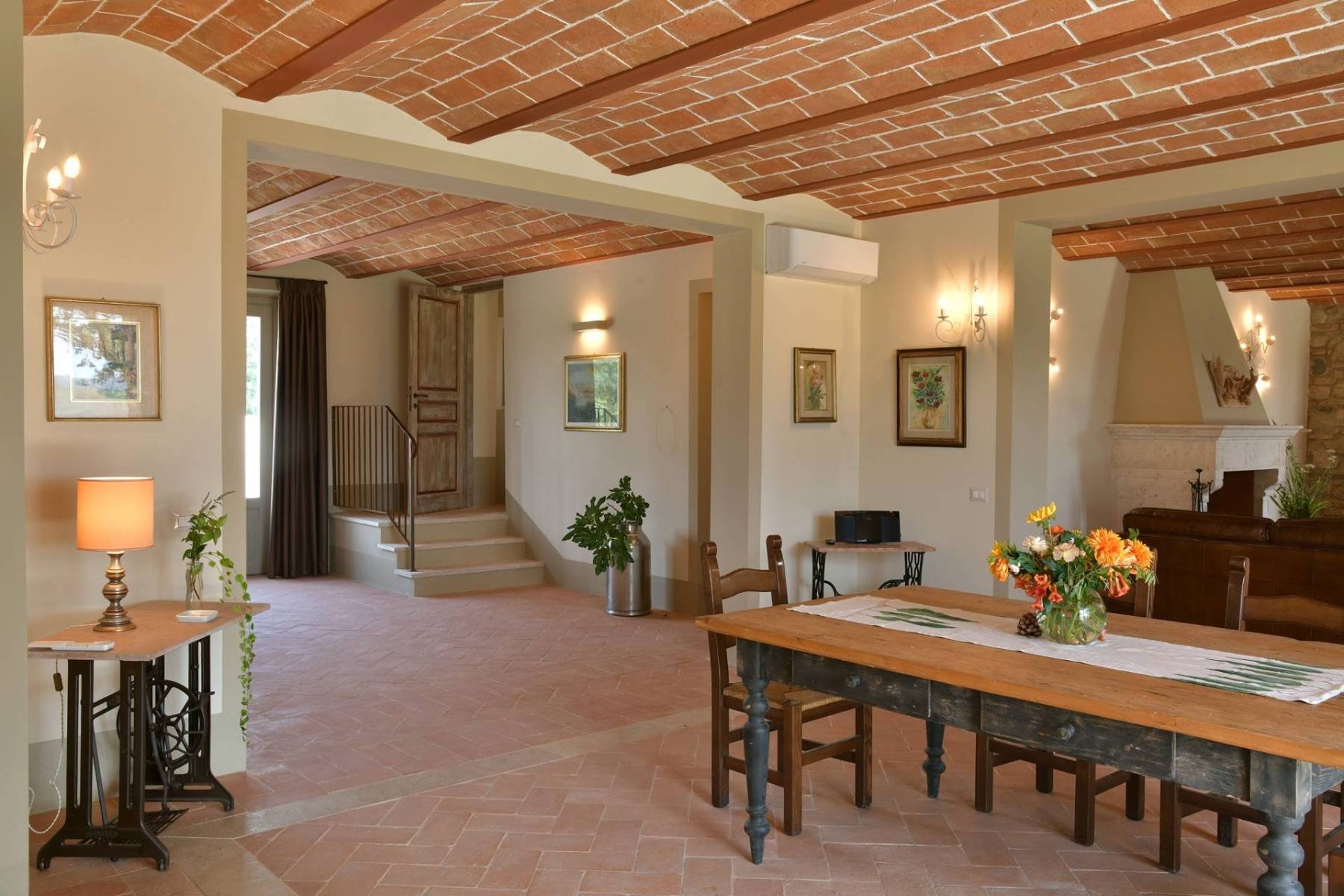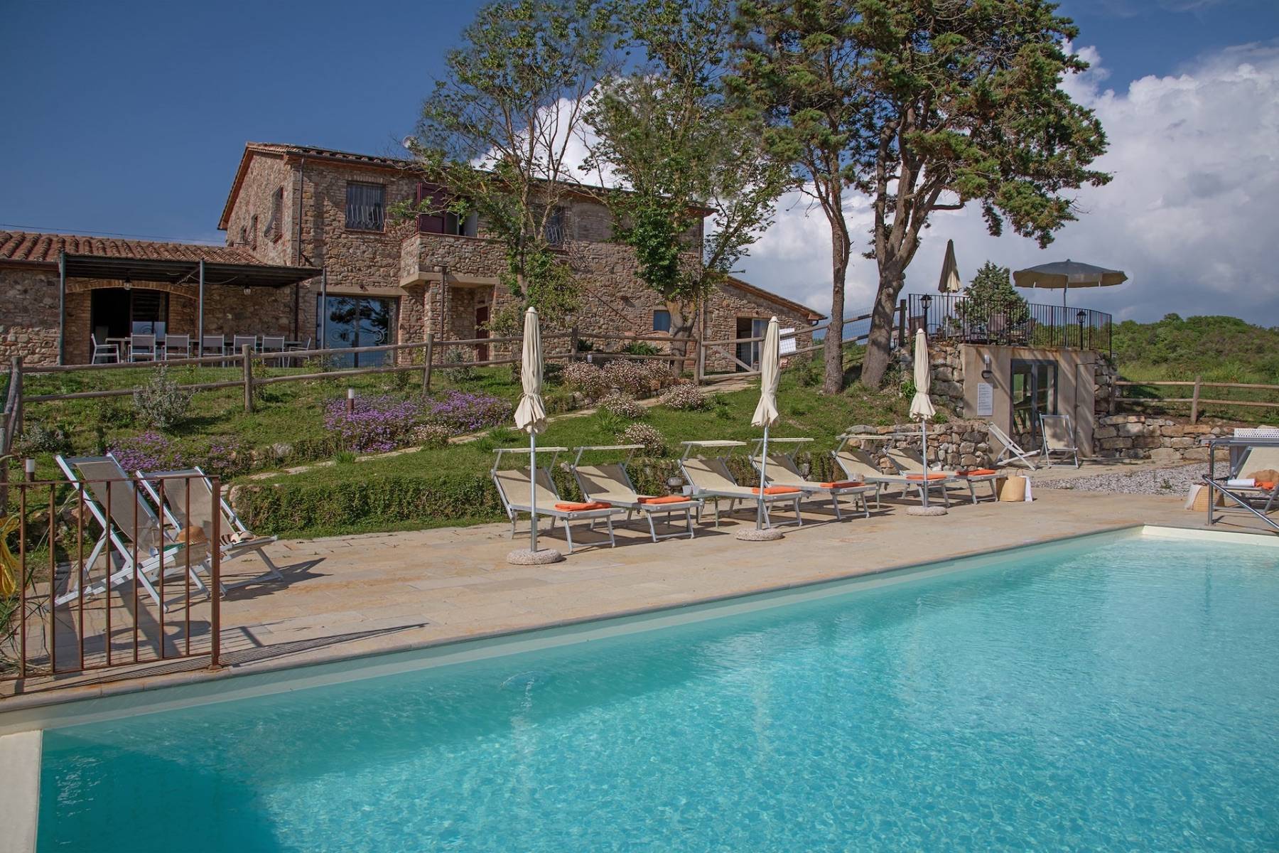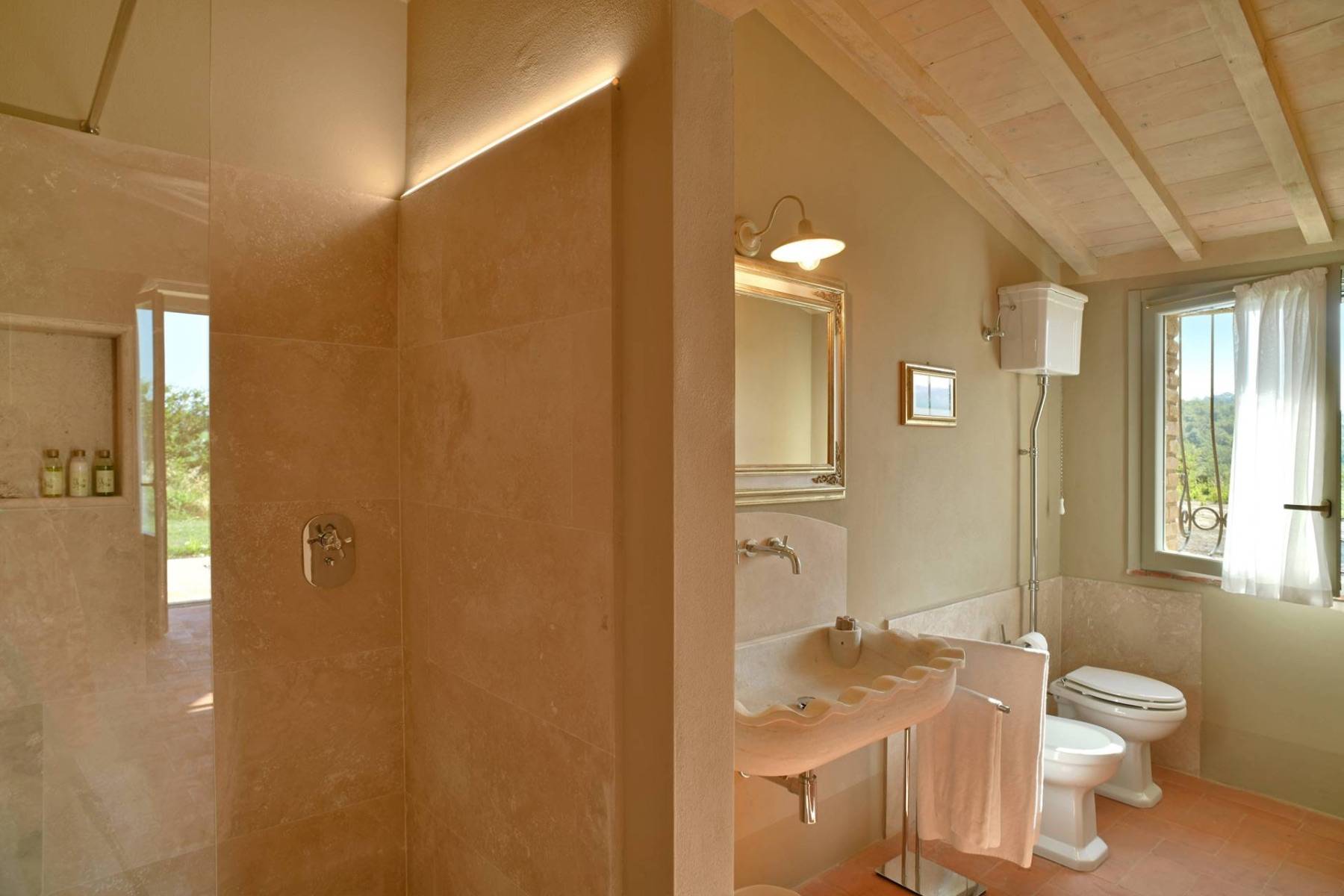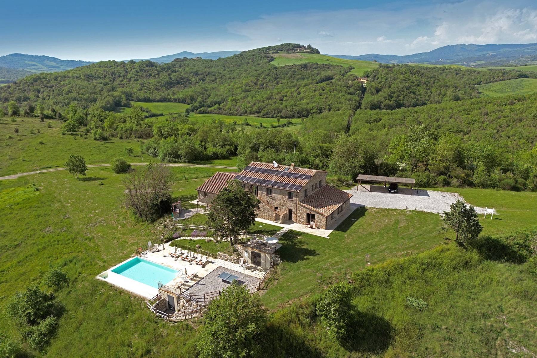 Eine etwa 700 m lange private Schotterstraße führt zu einem großen schattigen Parkplatz hinter dem toskanischen Landhaus. Das Landhaus erstreckt sich über zwei Etagen, die beide einen separaten Eingang haben, im Hausinneren aber durch eine gemeinsame Treppe verbunden sind.