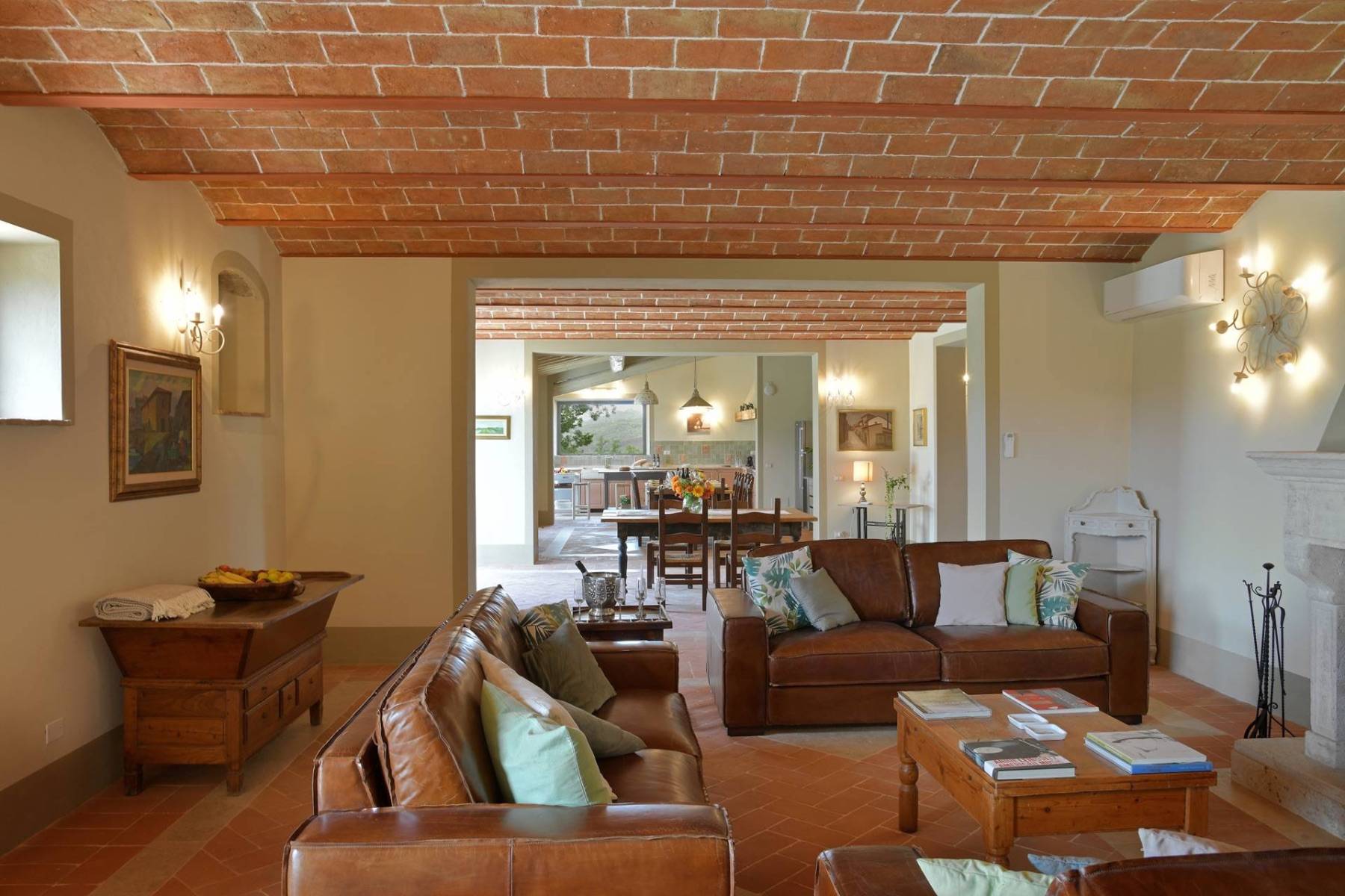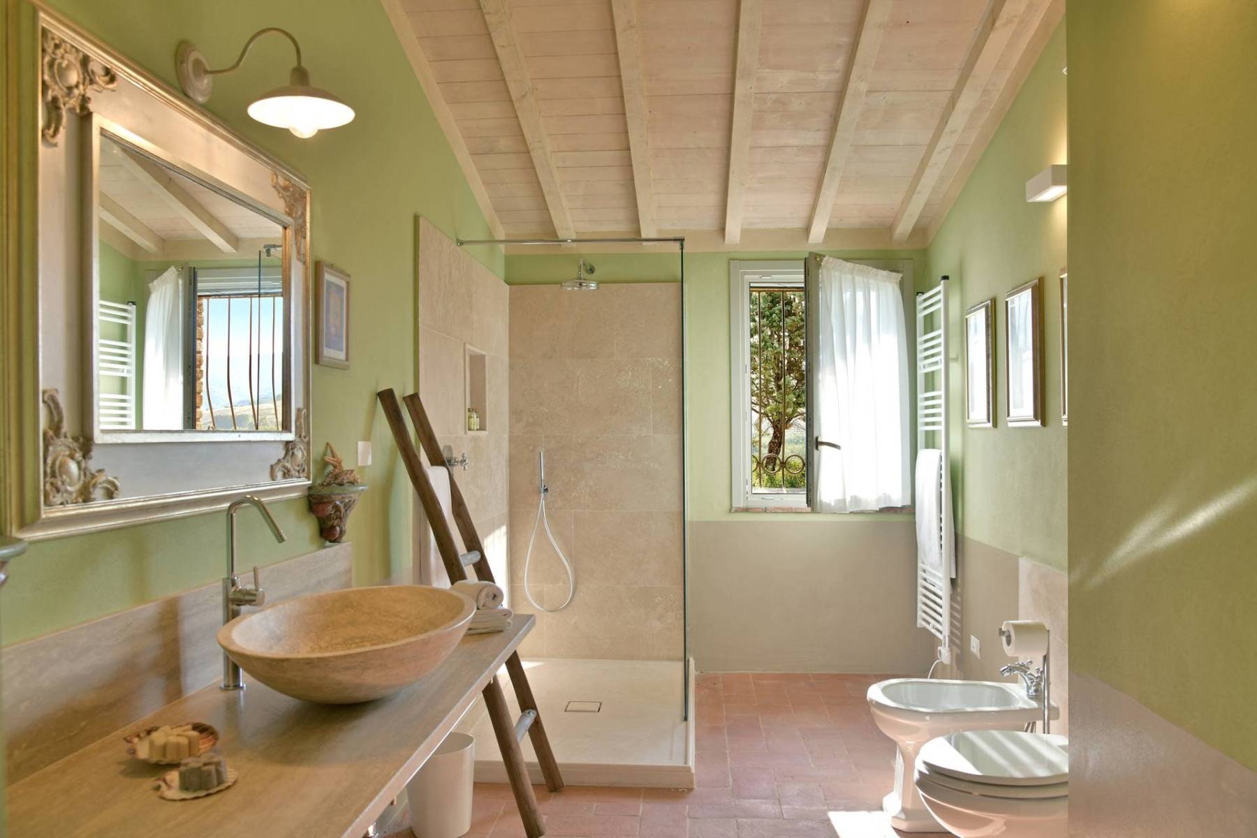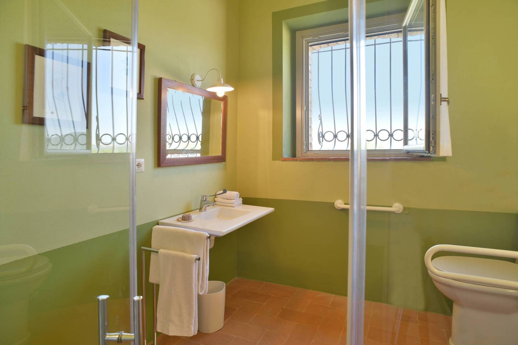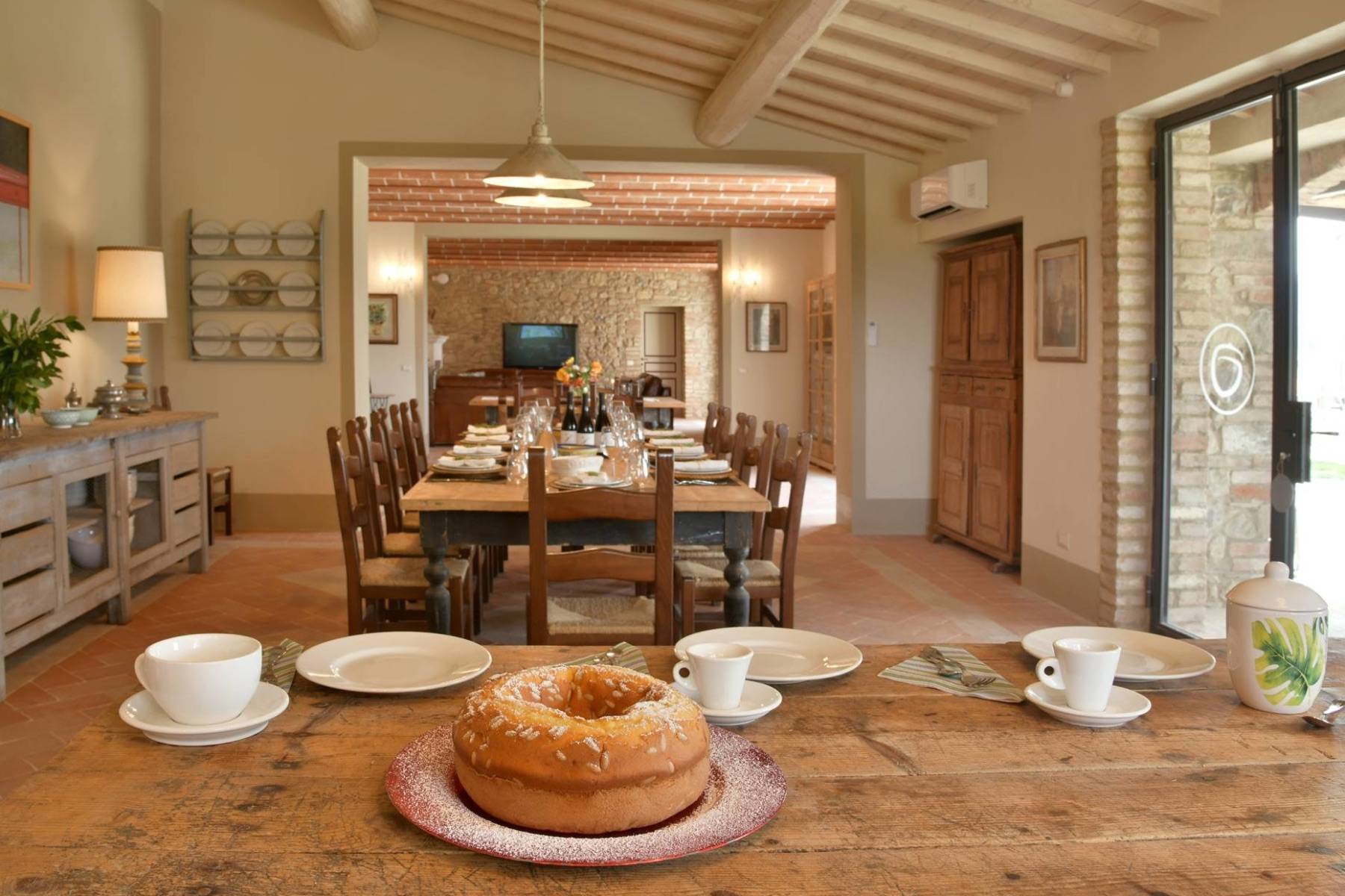 Eine etwa 700 m lange private Schotterstraße führt zu einem großen schattigen Parkplatz hinter dem toskanischen Landhaus. Das Landhaus erstreckt sich über zwei Etagen, die beide einen separaten Eingang haben, im Hausinneren aber durch eine gemeinsame Treppe verbunden sind.