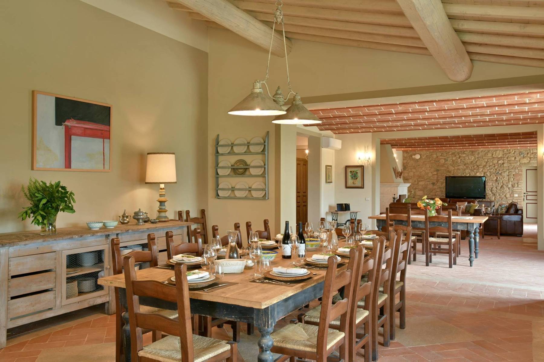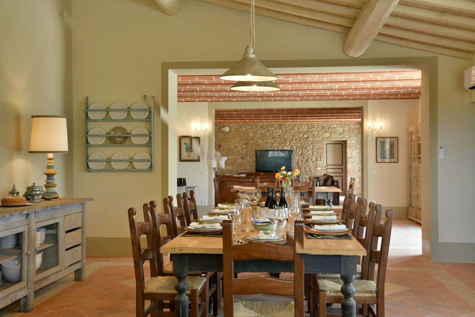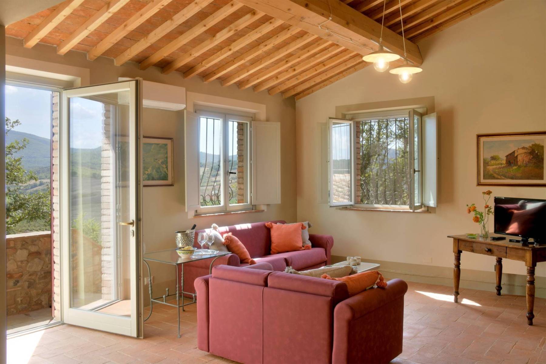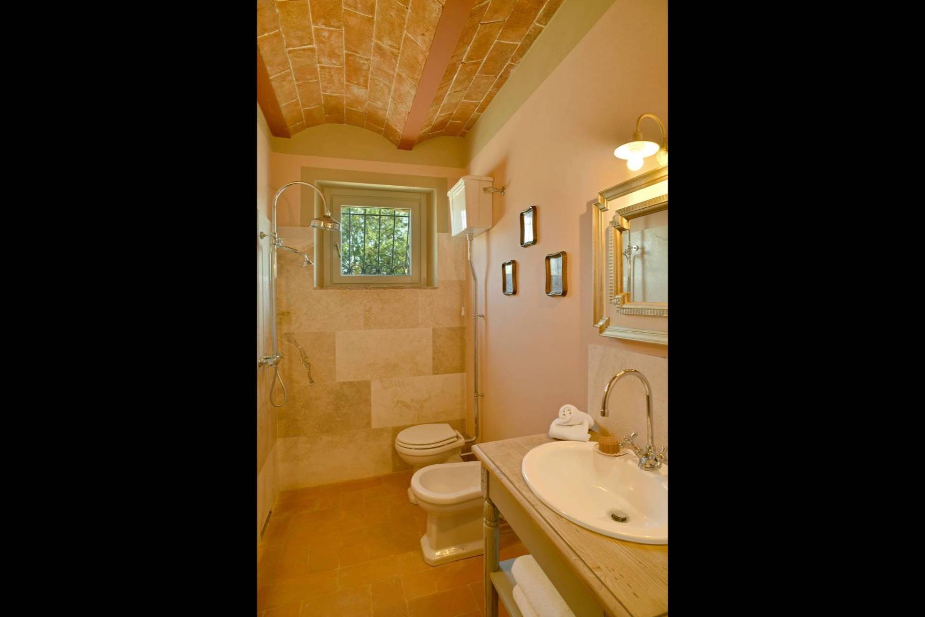 Eine etwa 700 m lange private Schotterstraße führt zu einem großen schattigen Parkplatz hinter dem toskanischen Landhaus. Das Landhaus erstreckt sich über zwei Etagen, die beide einen separaten Eingang haben, im Hausinneren aber durch eine gemeinsame Treppe verbunden sind.