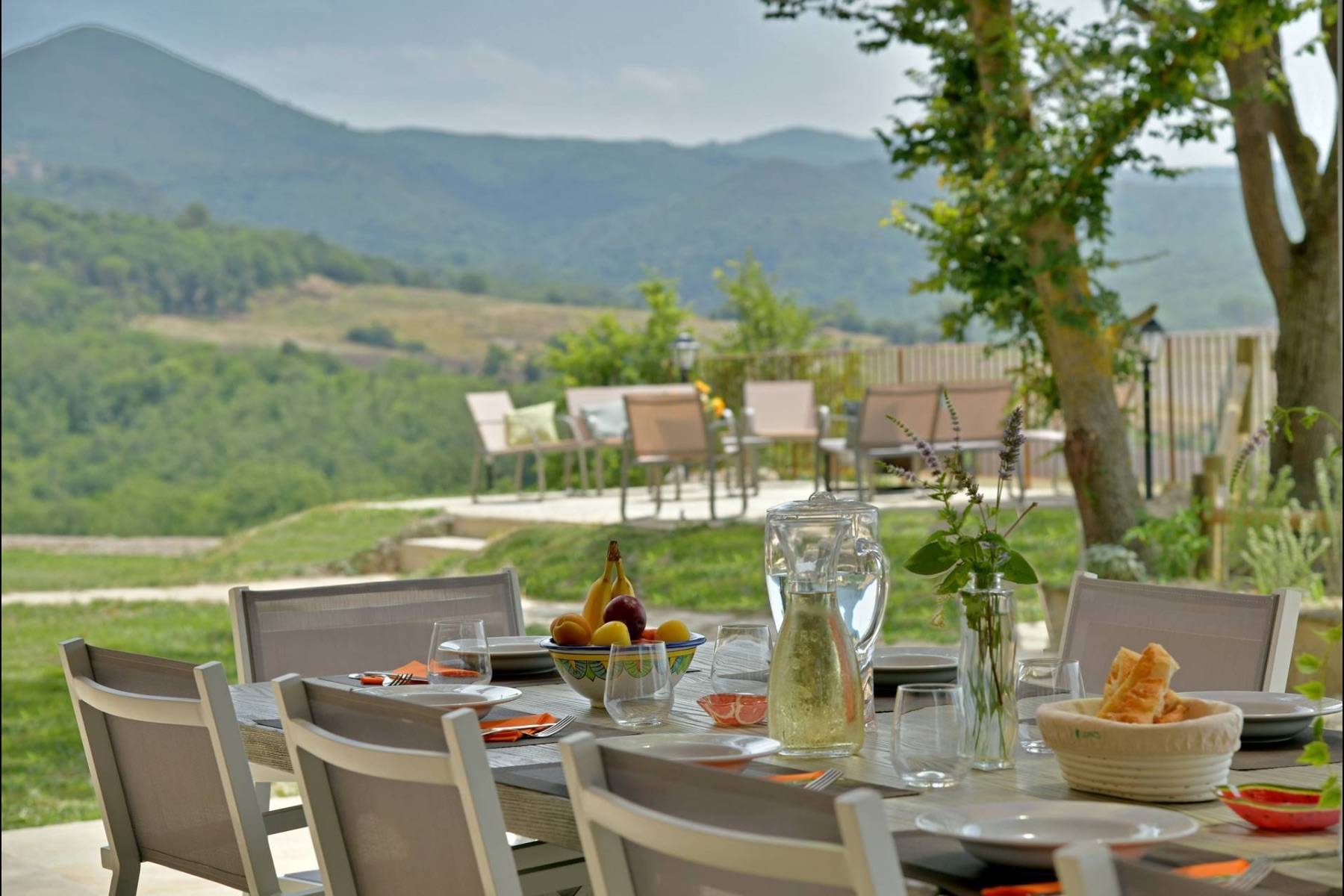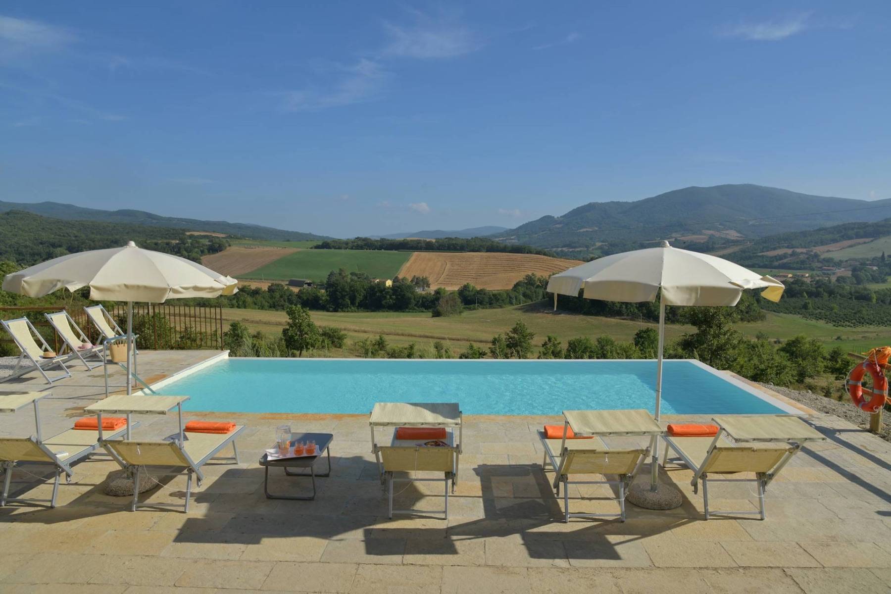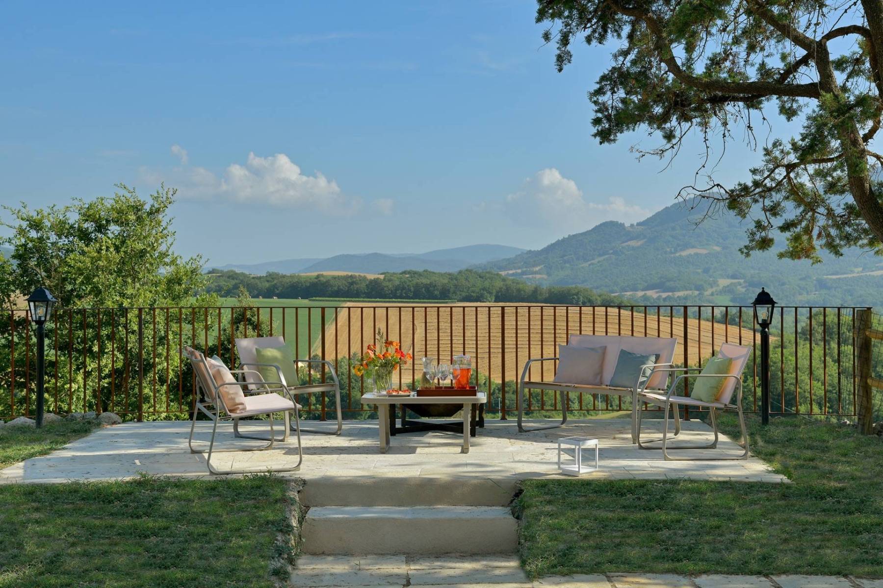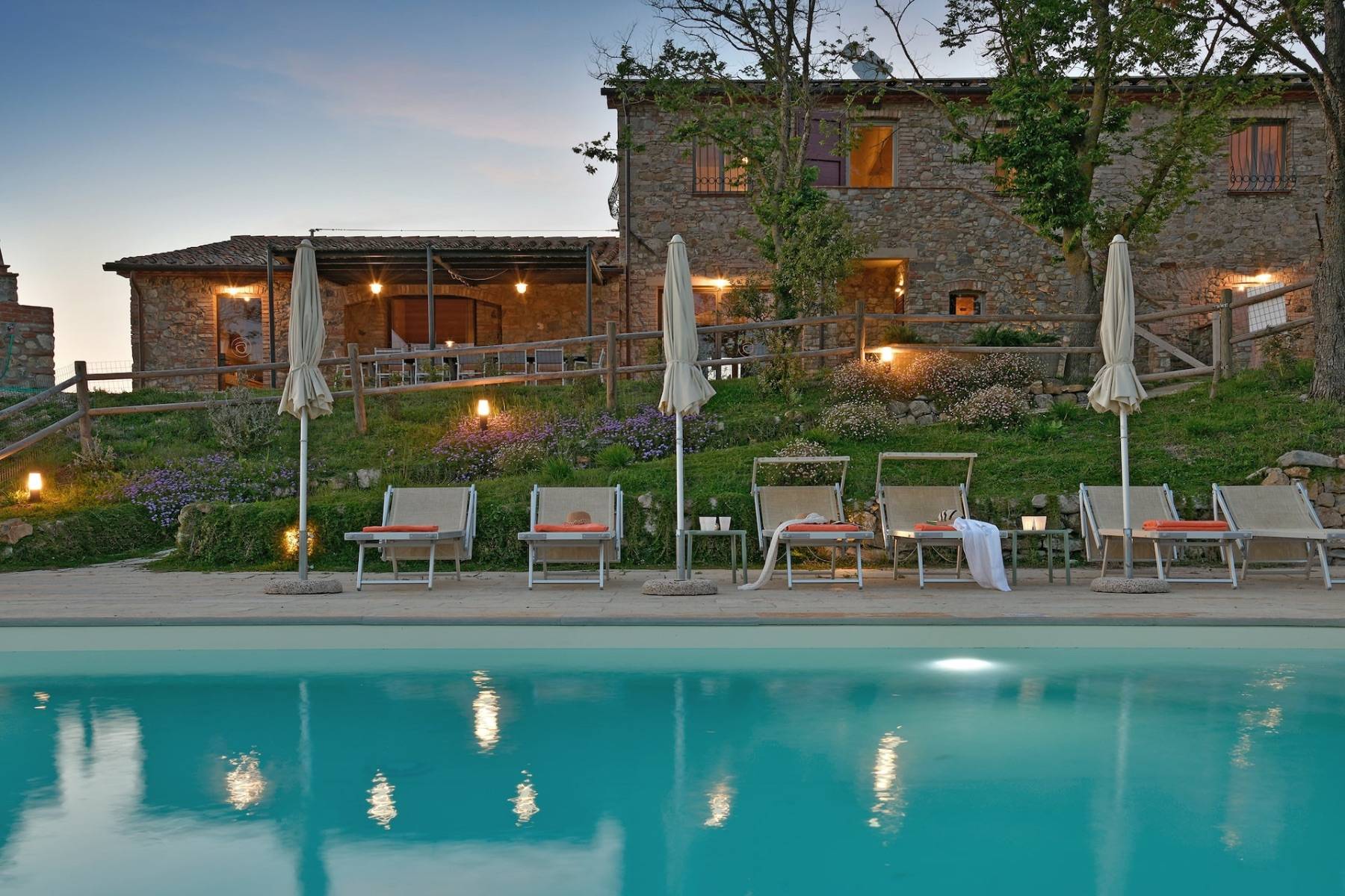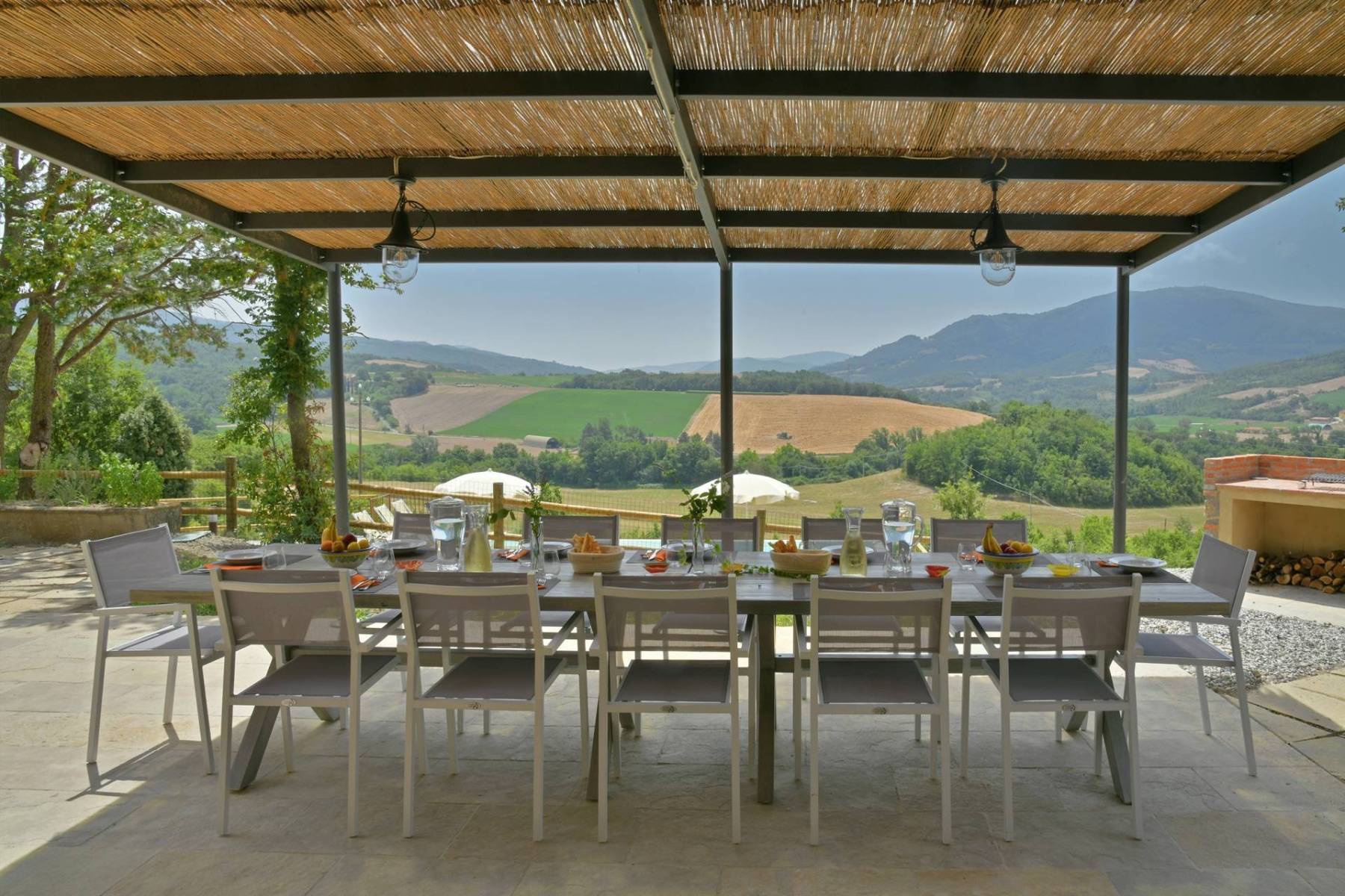 Ein besonderes Highlight dieses Landhauses liegt in seiner herrlichen Aussicht. Von der südseitigen großen Pergola mit Esstisch und bequemen Stühlen sind es nur ein paar Schritte zu einem gemauerten Grill, der mit Holz befeuert wird. Ein romantischer Pfad führt hinunter zum Infinity-Pool, der zur Sicherheit für die Kinder eingezäunt ist. Neben dem Schwimmbad wurde ein kleiner Raum mit Fitnessgeräten ausgestattet. Eine charmante Terrasse mit Garten- Loungesofas und -sesseln rund um eine einladende Feuerschale rundet das äußere Bild ab.