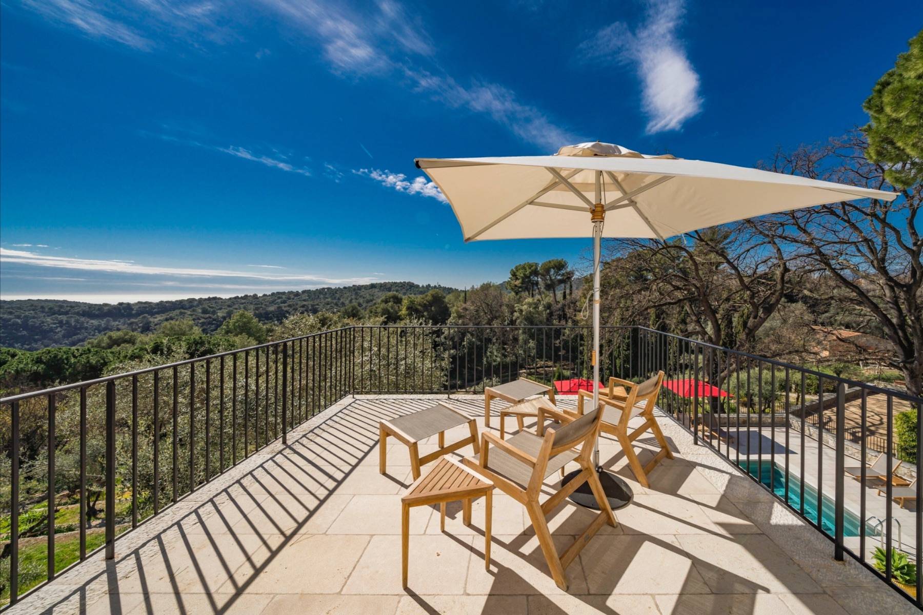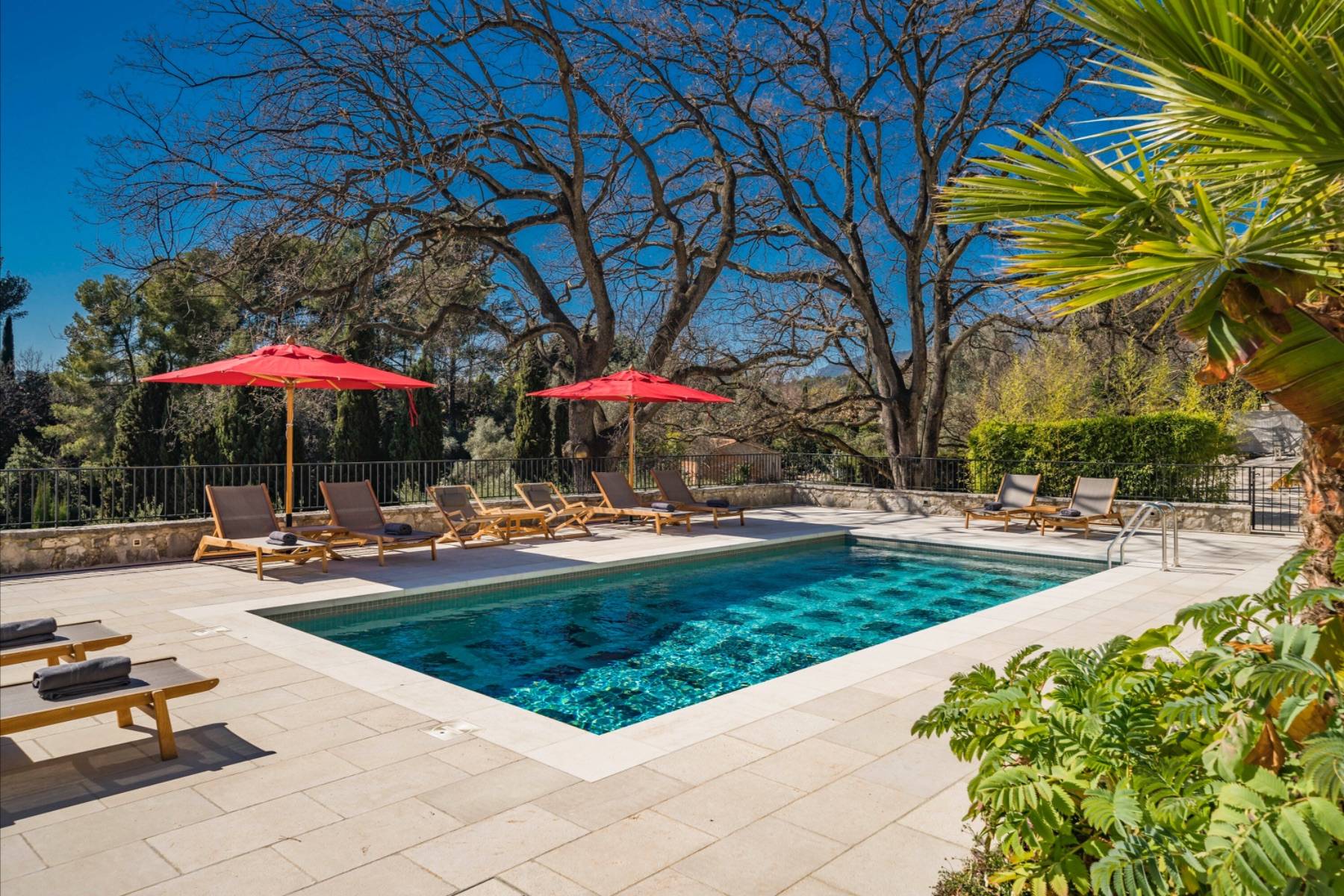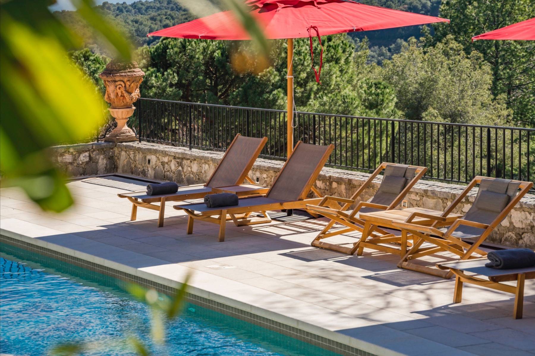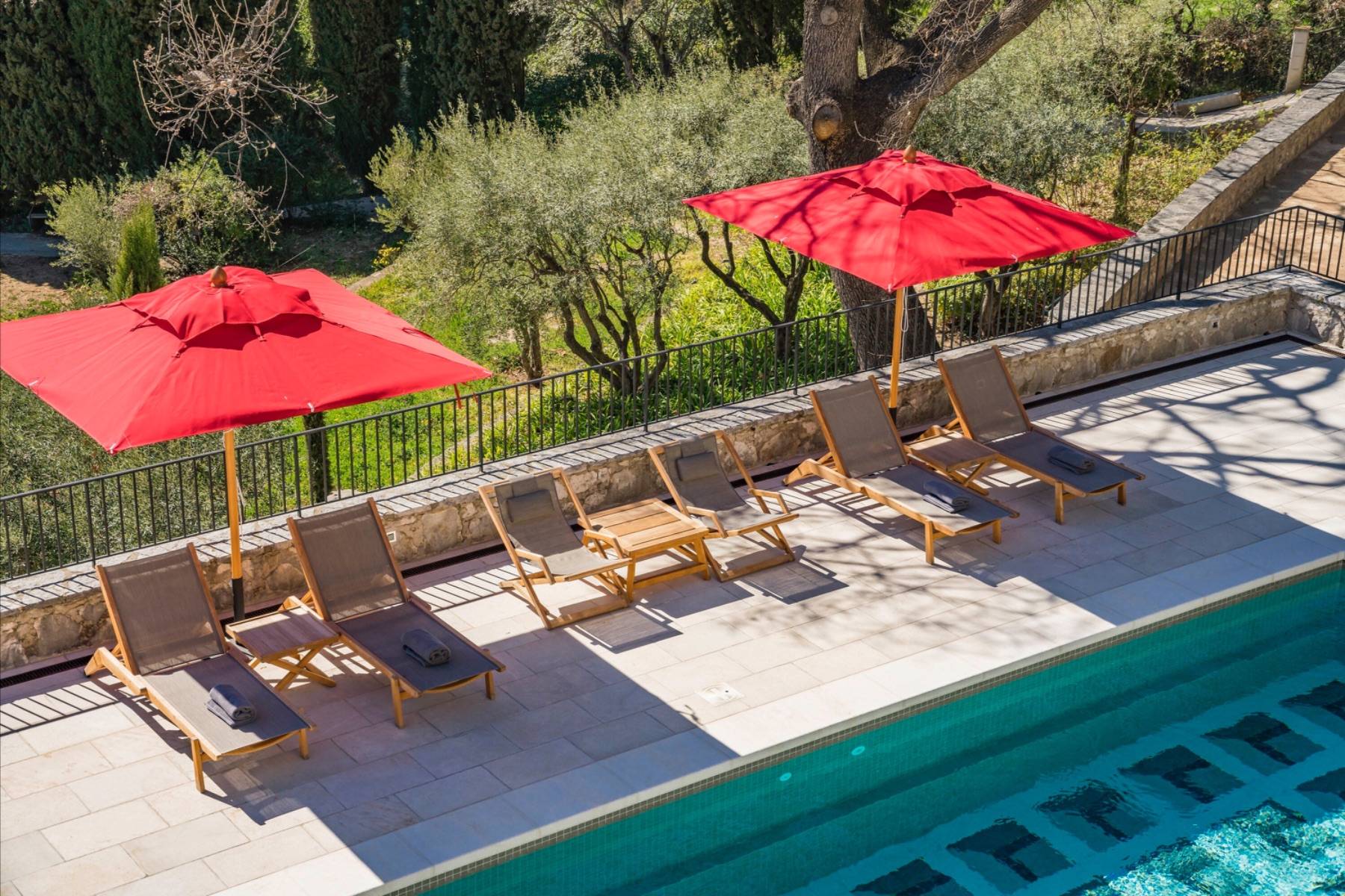 Die schönen großen französischen Terrassen bieten die Möglichkeit, draußen zu faulenzen, sich zu entspannen und bei Abendbeleuchtung zu speisen, die die Villa in ein wahres Märchen verwandelt. Der schöne große Pool ist von einer großen Sonnenterrasse mit bequemen Sonnenliegen und farbigen Sonnenschirmen umgeben. Vom Pool aus können Sie in den felsigen Garten gehen und den spektakulären Blick über die Hügel von Vence genießen.
