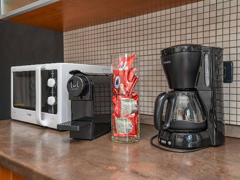 Esstisch Geschirrhandtücher Induktionskochfeld Kaffeemaschine Kühl- / Gefrierschrank Mikrowelle Seeblick Sofa Stühle