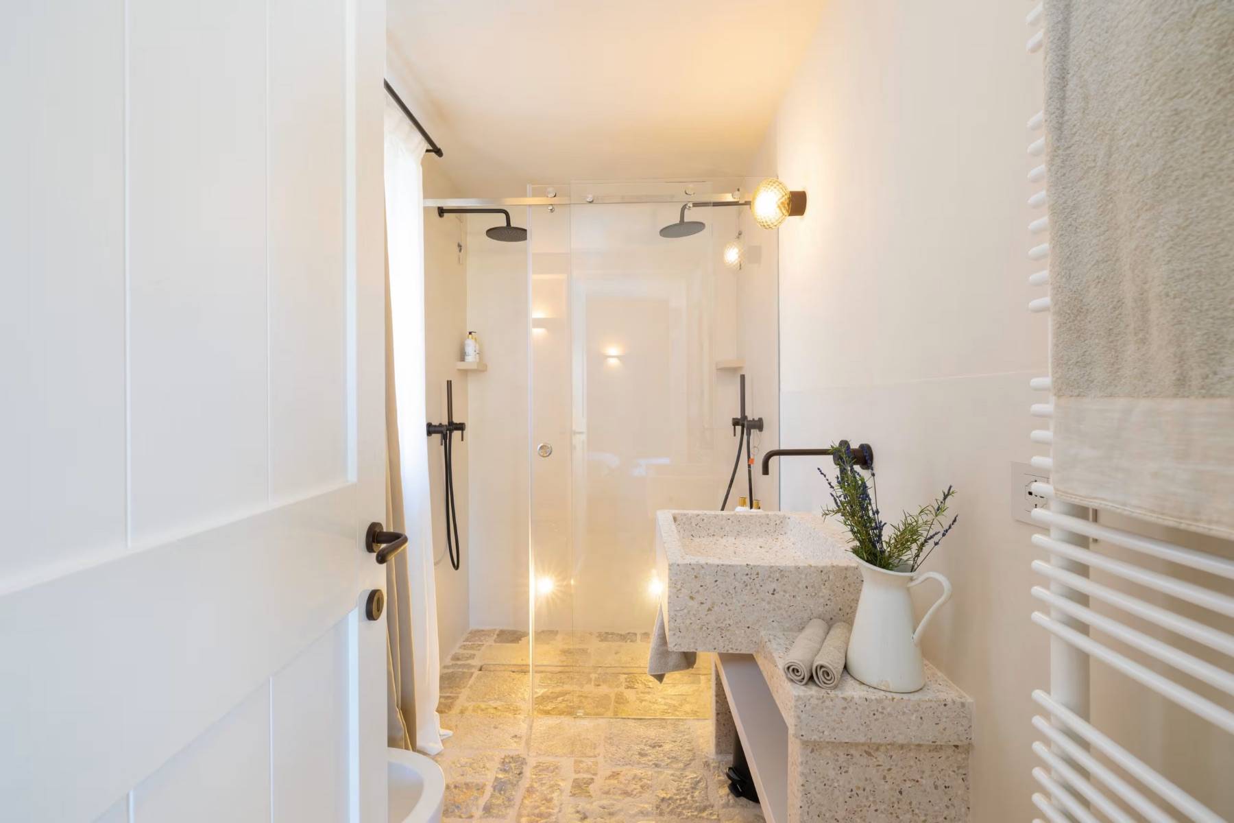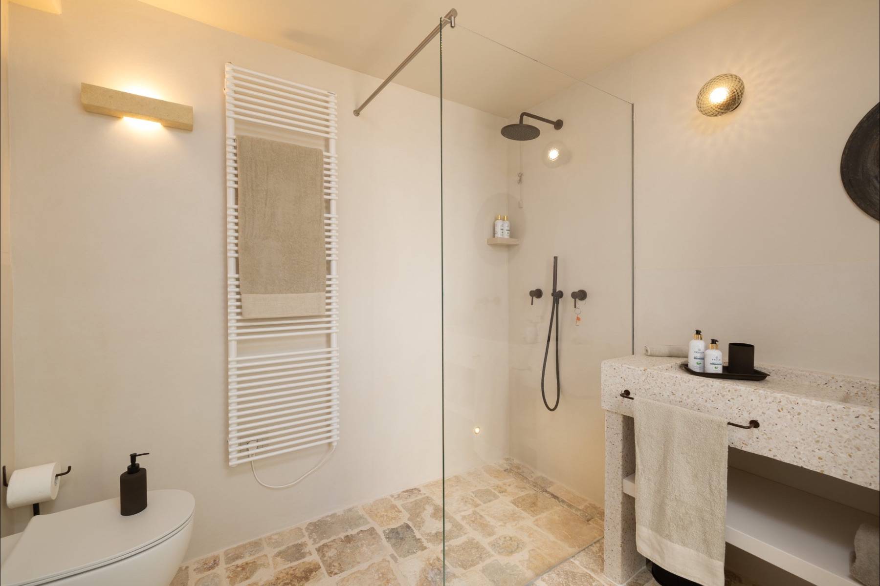 Badetuch Bidet Fußbodenheizung Haartrockner Handtuch Handtuchheizkörper Spiegel Terrassenzugang Walk- In- Dusche Waschbecken WC