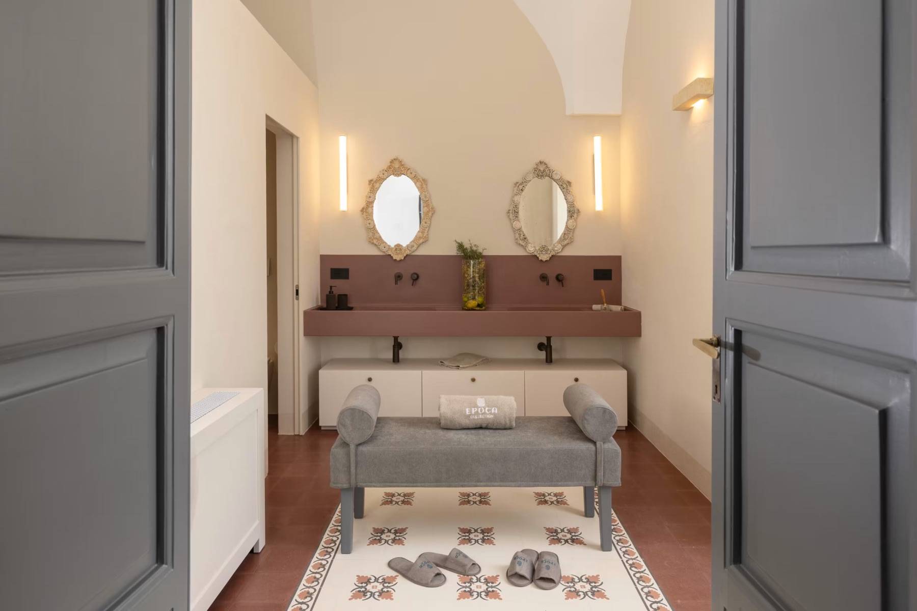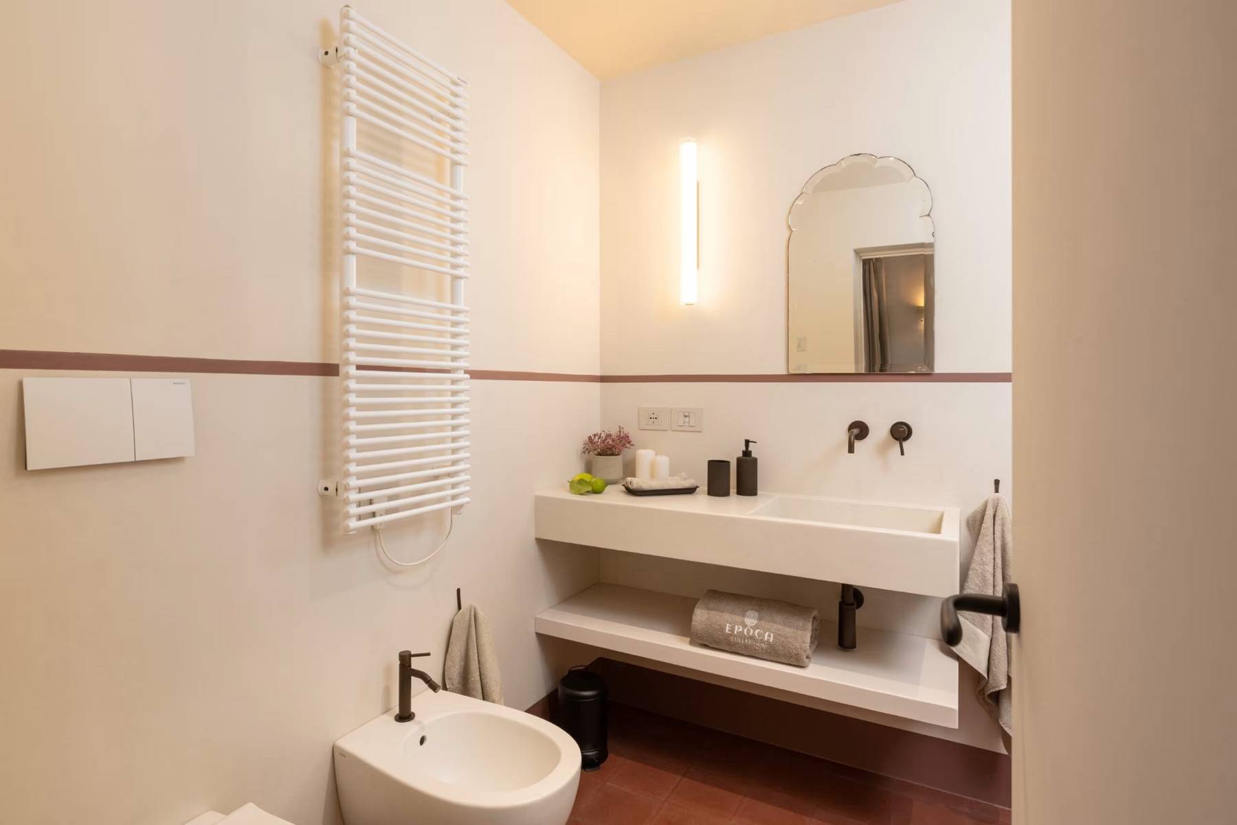 Badetuch Bidet Doppelwaschbecken Fenster Fußbodenheizung Haartrockner Handtuch Handtuchheizkörper Hocker Spiegel Terrassenzugang WC