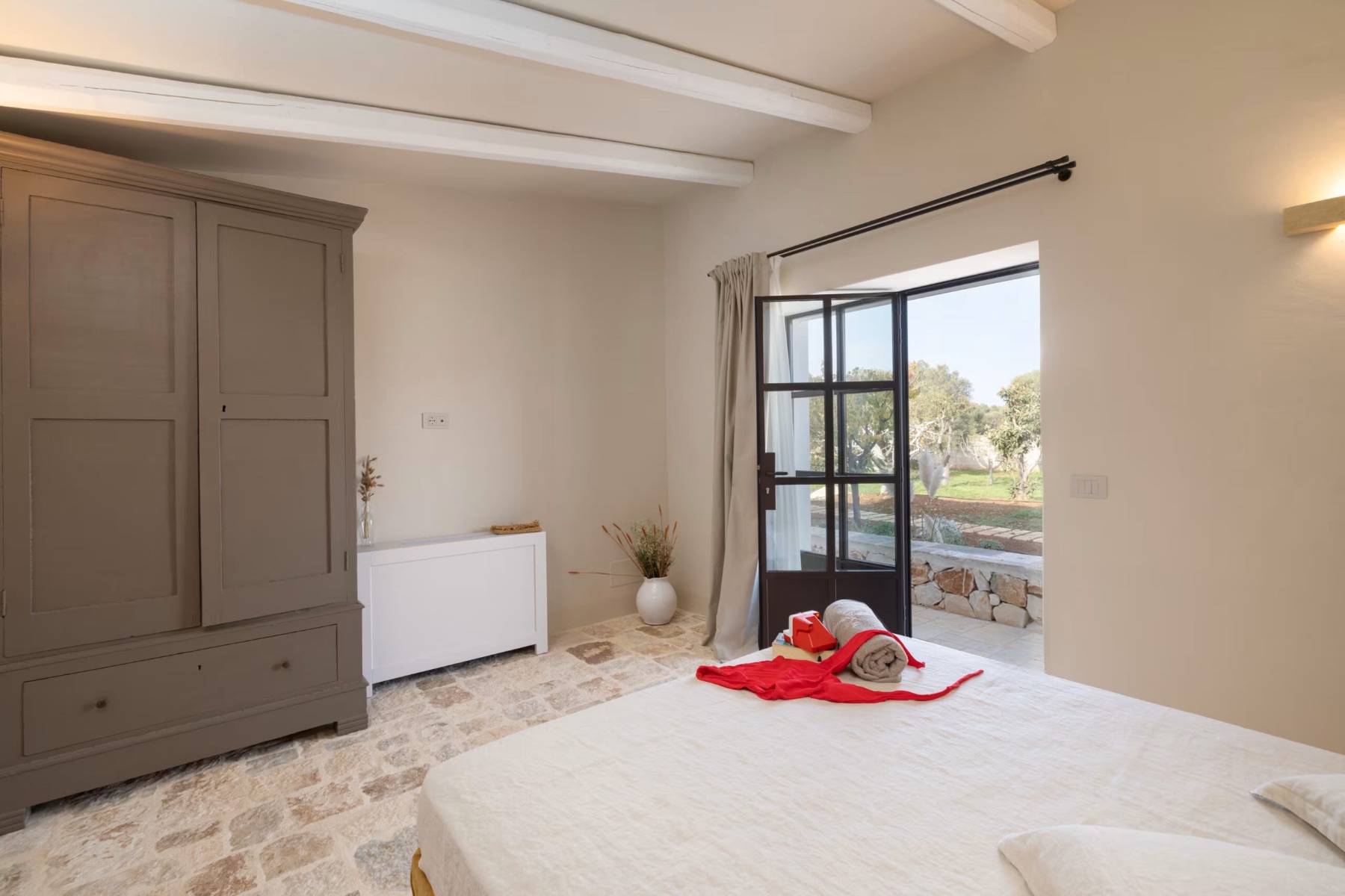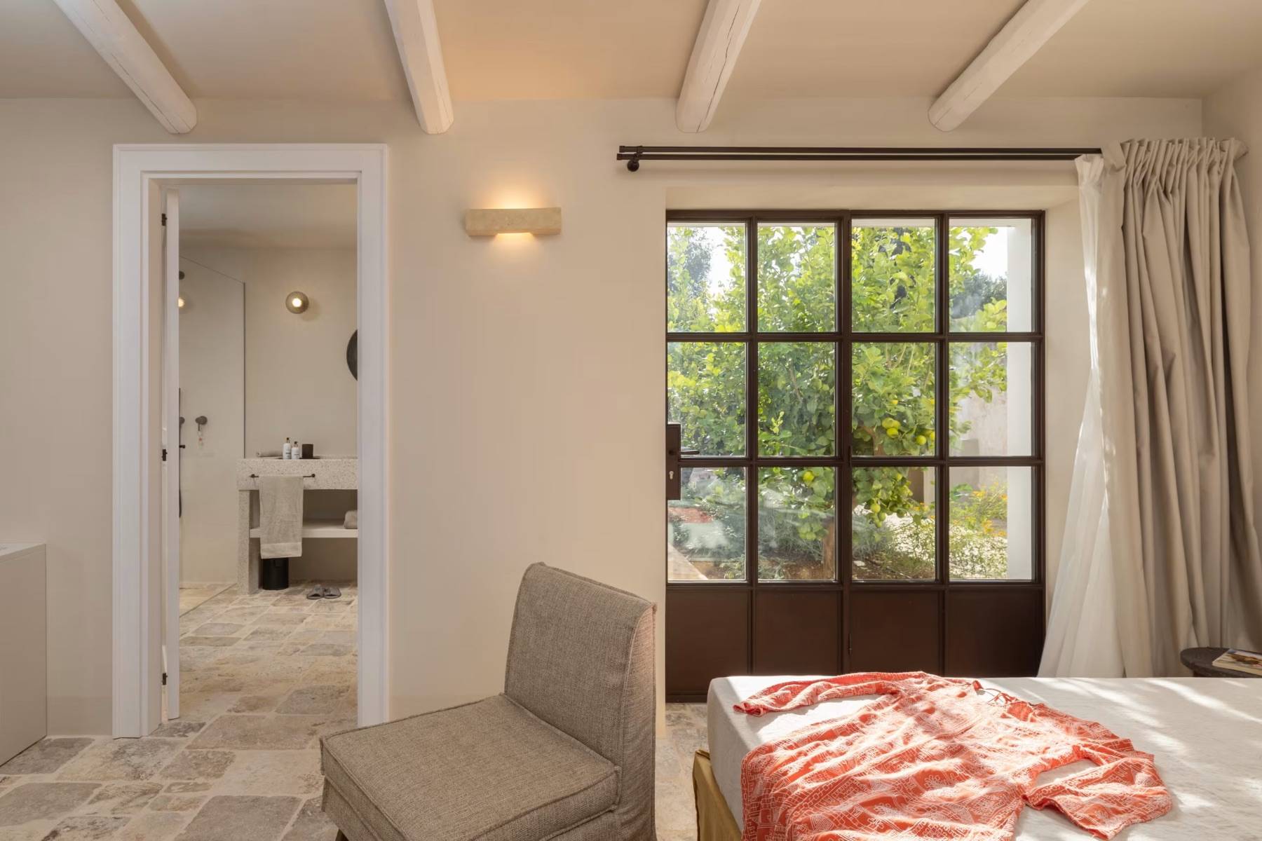 Bettwäsche Doppelbett Fenster Fußbodenheizung Kleiderschrank Klimaanlage Stuhl Terrassenzugang Vorhänge