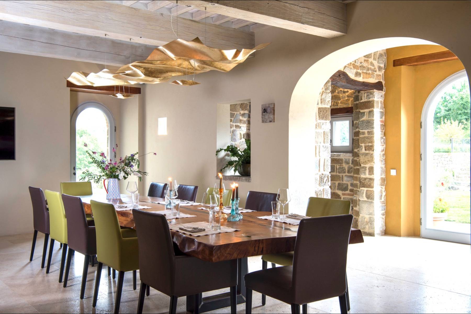 Der Speisesaal bietet Platz für 10 Personen, aber die Gäste haben auch die Möglichkeit, unter der Loggia an einem weiteren grossen wunderschönen Massivholztisch zu speisen.