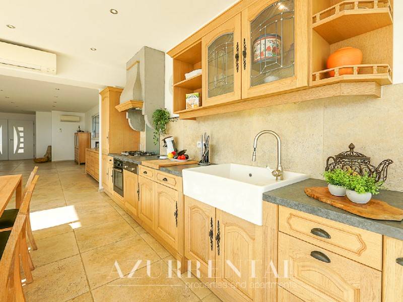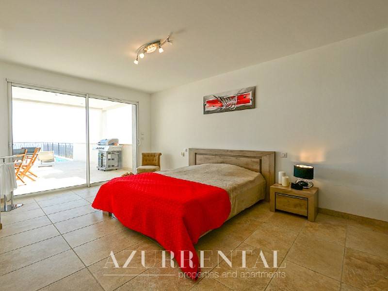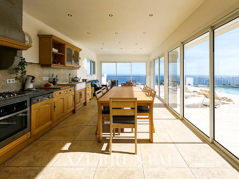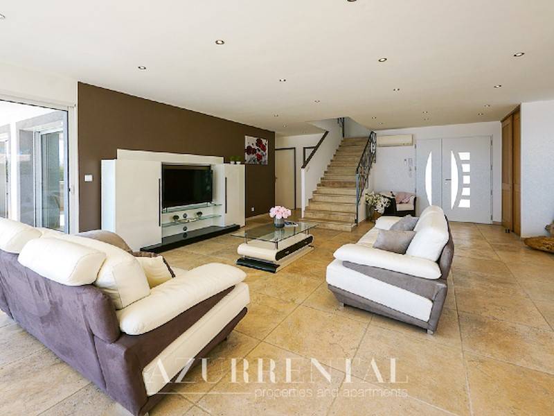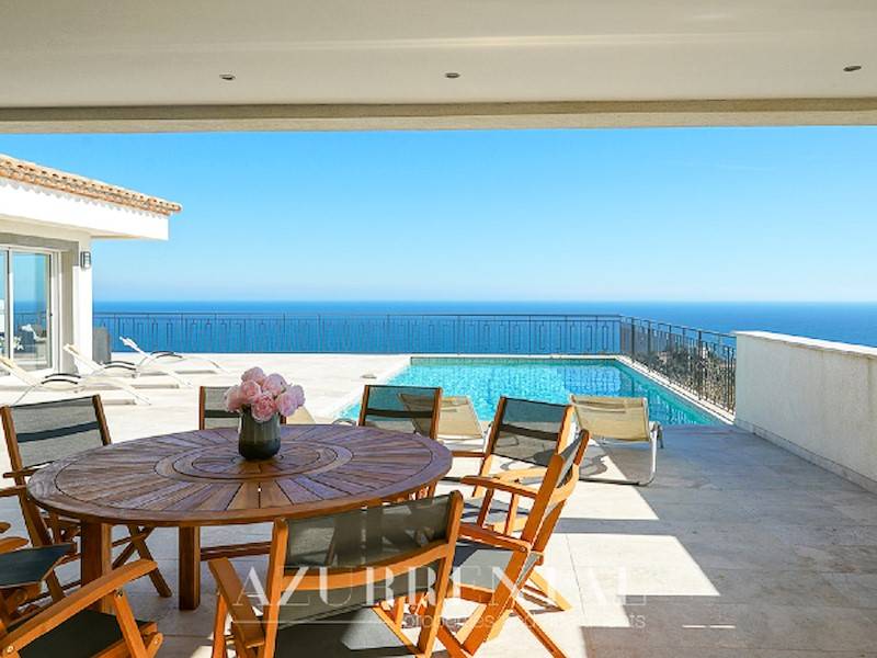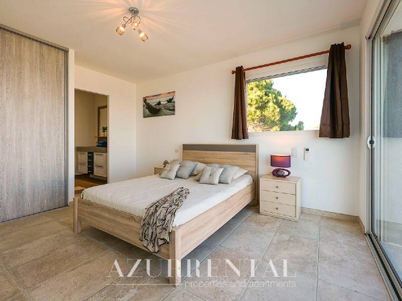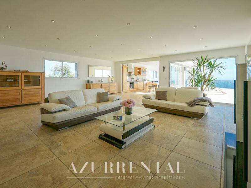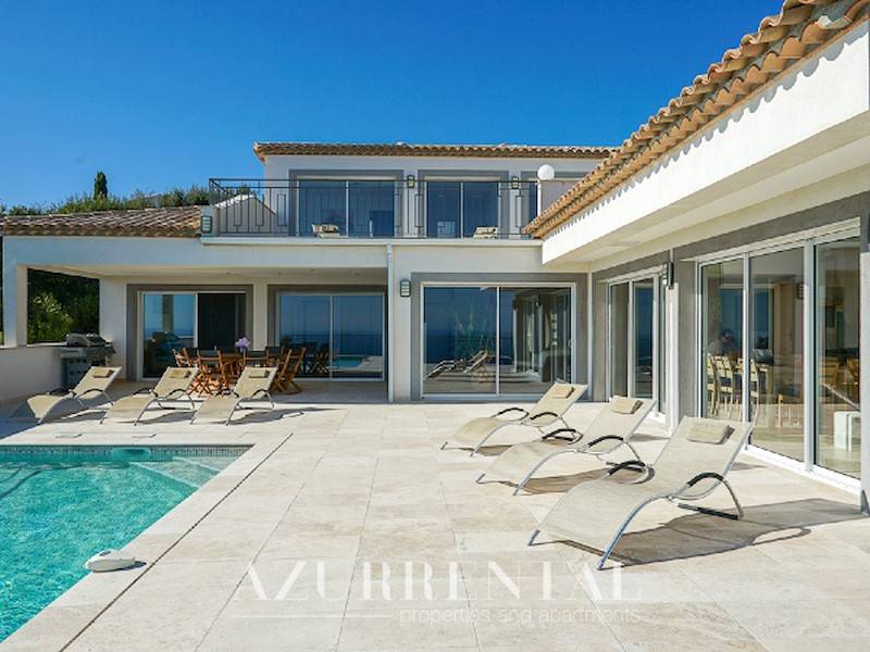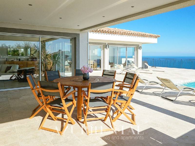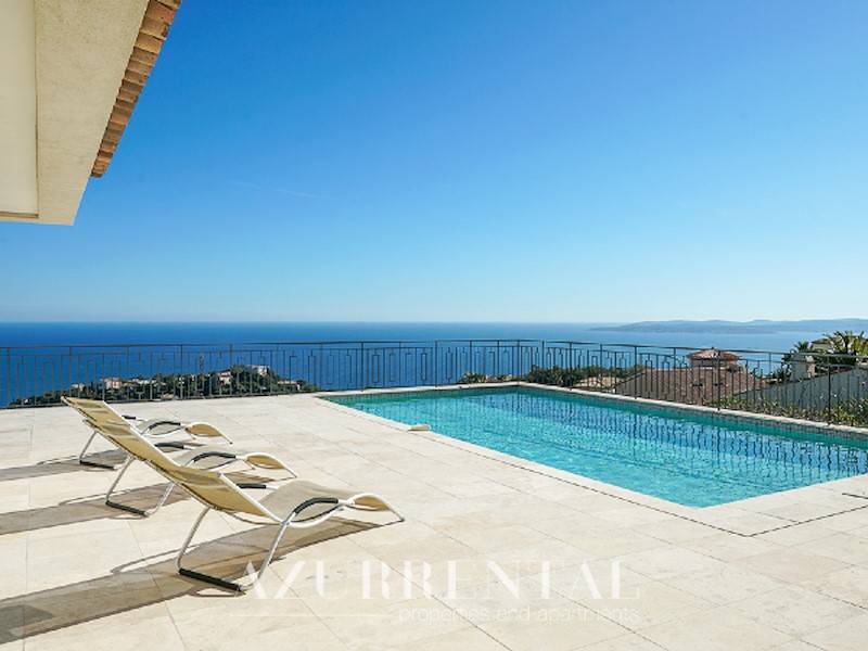 Ein spektakulärer 270° Panorama-Meerblick von nahezu allen Räumlichkeiten in die Bucht von St. Raphael und in die Bucht von St. Tropez zeichnet dieses Anwesen aus. Das Interieur ist weitläufig gestaltet und durch große bodentief verglaste Fensterflächen sehr hell und freundlich. Die moderne Ausstattung umfasst Bodenbeläge und attraktive Waschtische in den Bädern aus Naturstein.