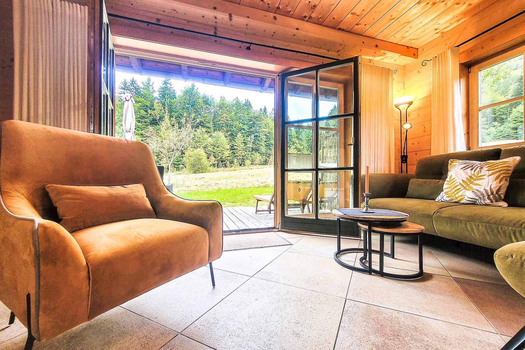 Der offene Wohn-, Ess- und Kochbereich erstreckt sich über 32 m² und ist äußerst gemütlich und komfortabel eingerichtet und ausgestattet. Nach einem ausgedehnten Spaziergang in der wunderbaren Winterlandschaft ist es herrlich, sich am knisternden Kamin wieder aufzuwärmen. Vom Wohnraum aus gelangt man auch auf die nach Südwest ausgerichtete Terrasse, auf der ein Jacuzzi zu jeder Jahreszeit zum entspannen einlädt.