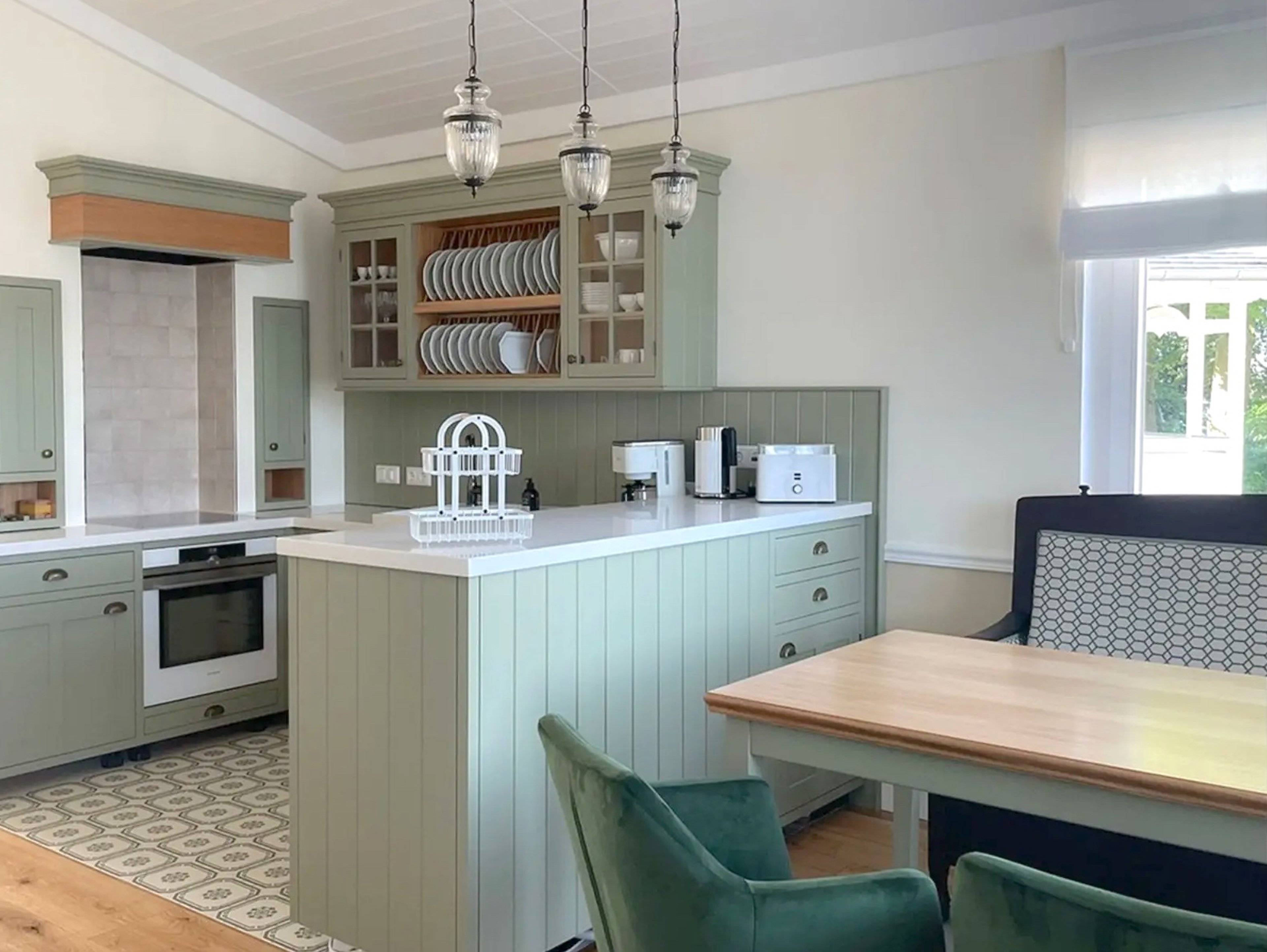 Die gemütliche Wohnküche im englischen Landhausstil ist voll ausgestattet, der Essbereich bietet als Besonderheit ein schwedisches Küchensofa.