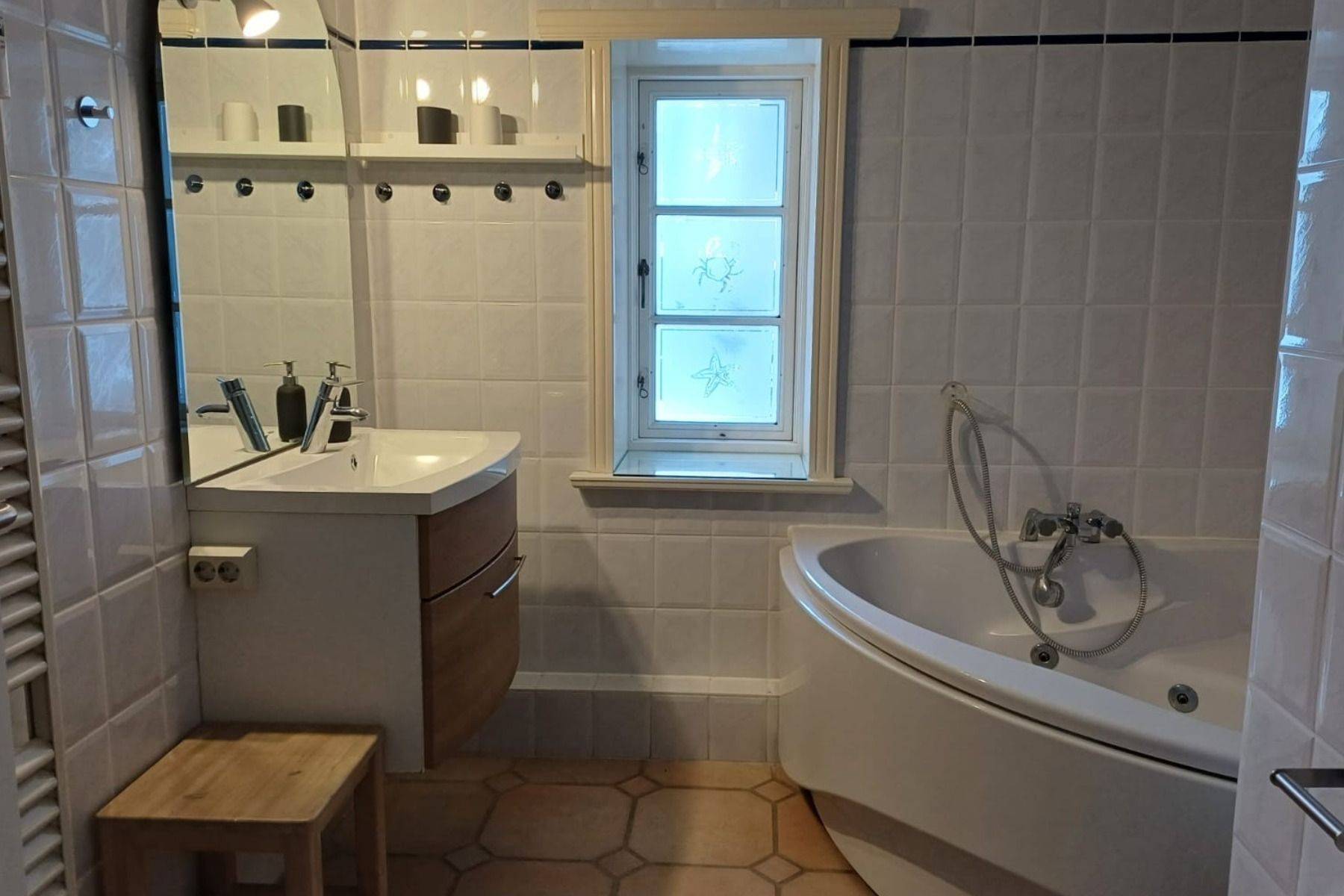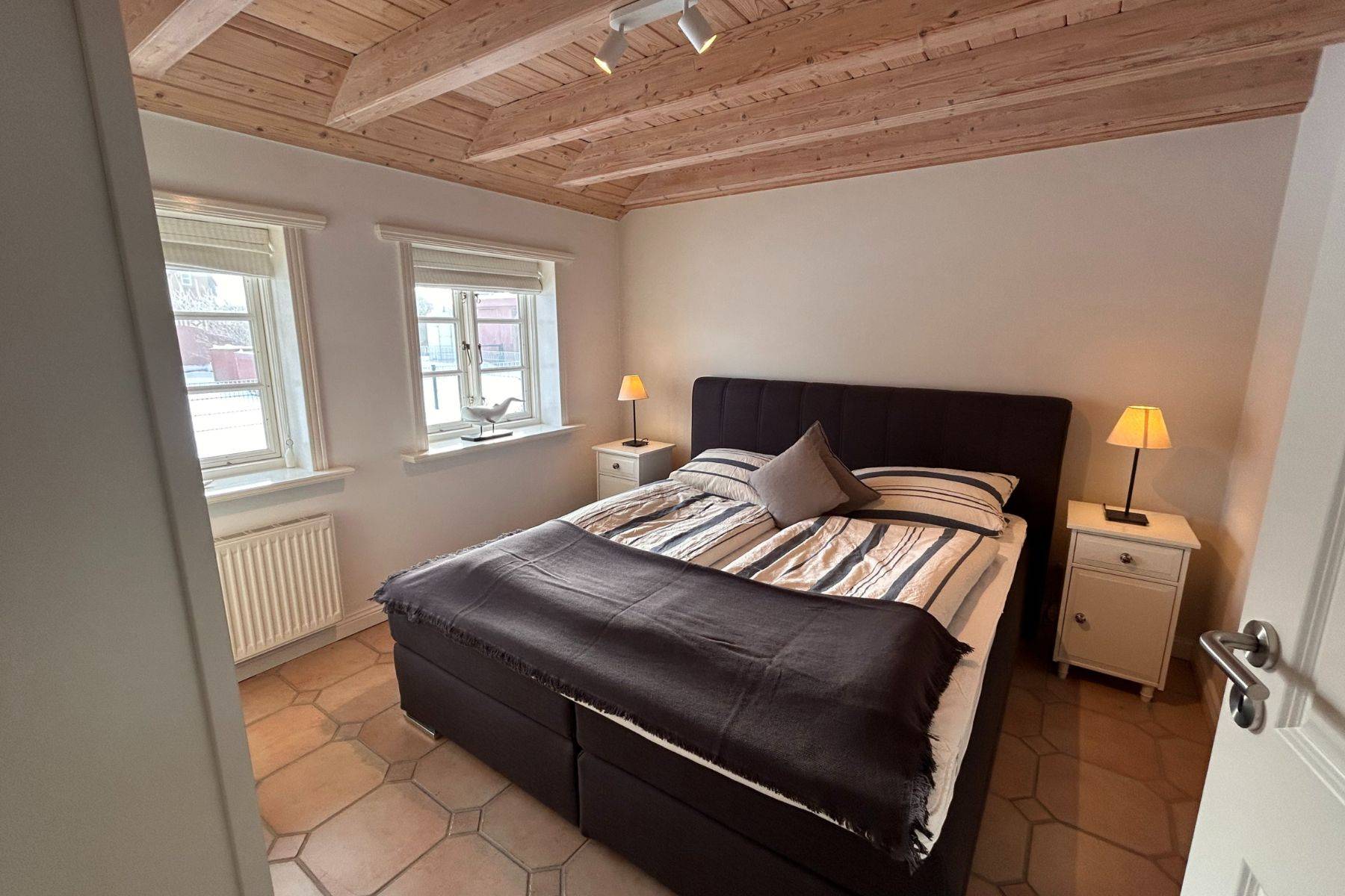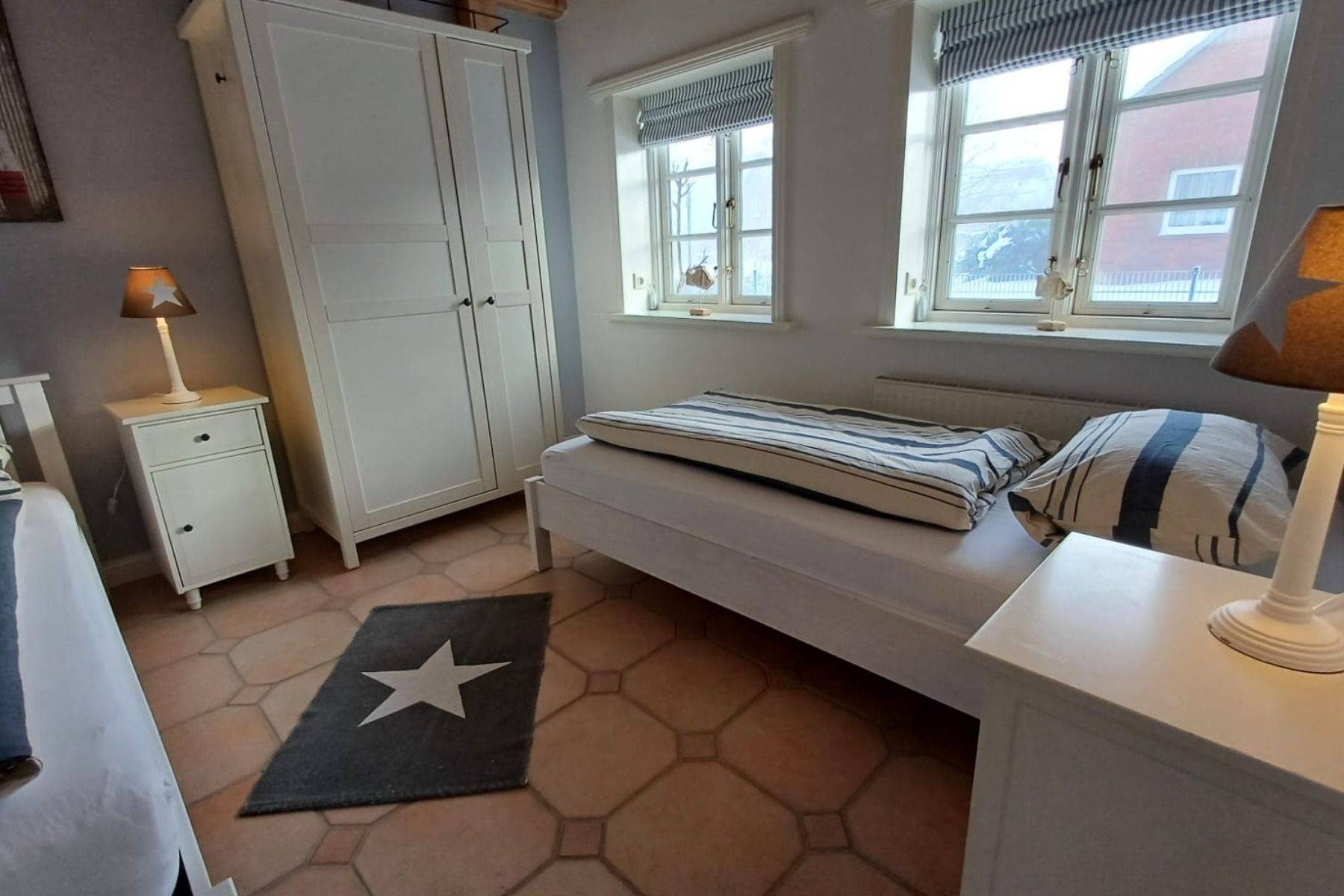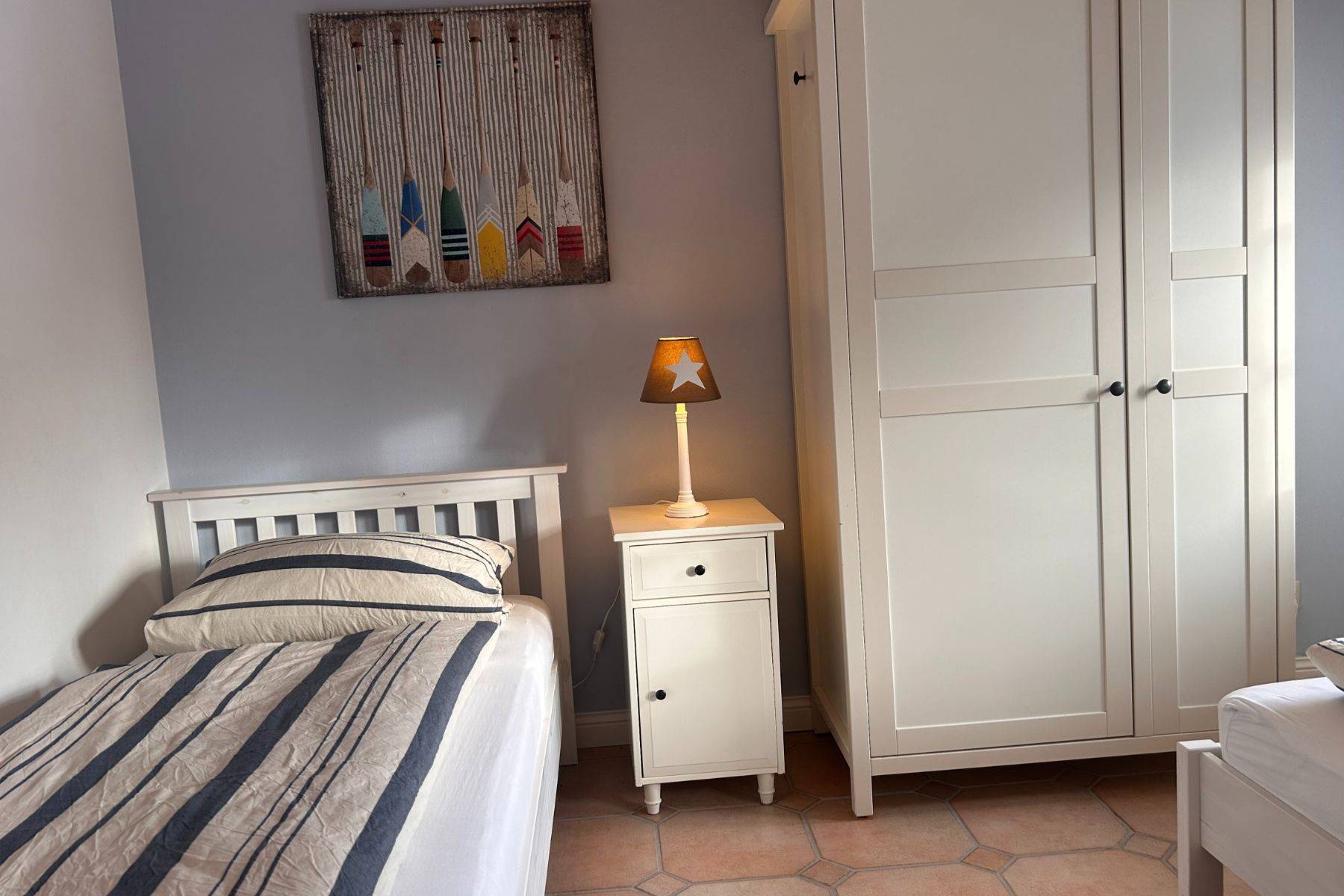 Angrenzend befinden sich zwei liebevoll eingerichtete Schlafzimmer – eines mit bequemem Doppel-Boxspringbett, das andere mit zwei Einzelbetten, ideal für Kinder. Das großzügige Badezimmer mit Dusche und Badewanne ist besonders familienfreundlich und lädt auch nach einem Strandtag zum Entspannen ein. Für ein Babybett ist ausreichend Platz vorhanden, sodass auch die kleinsten Gäste bestens untergebracht sind.