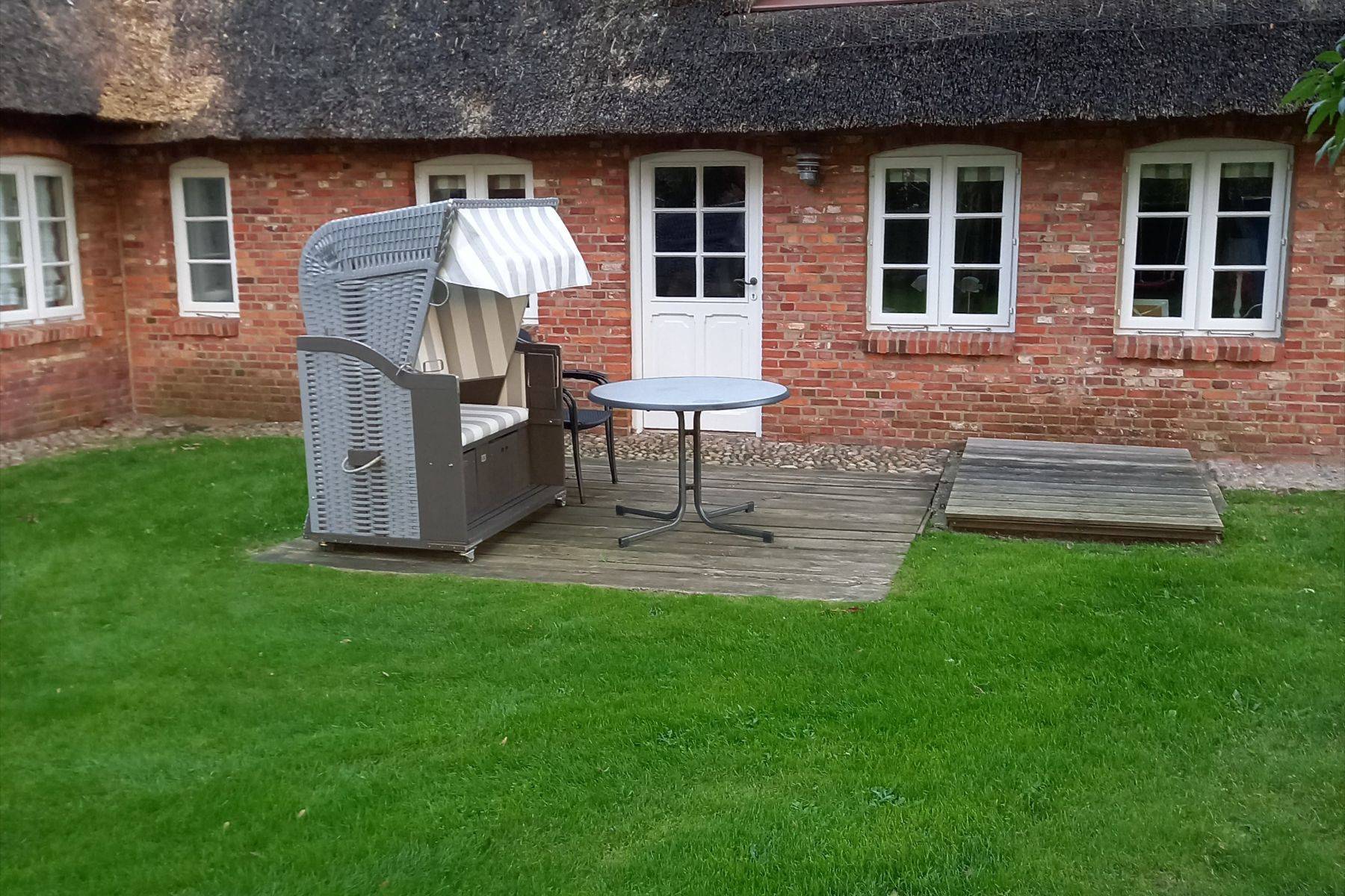 Von der Terrasse mit Strandkorb und Gartenmöbeln gelangt man direkt in den Wohnbereich – perfekt für ein Frühstück in der Sonne oder einen ruhigen Abend im Freien, während die Kinder in sicherer Umgebung spielen.