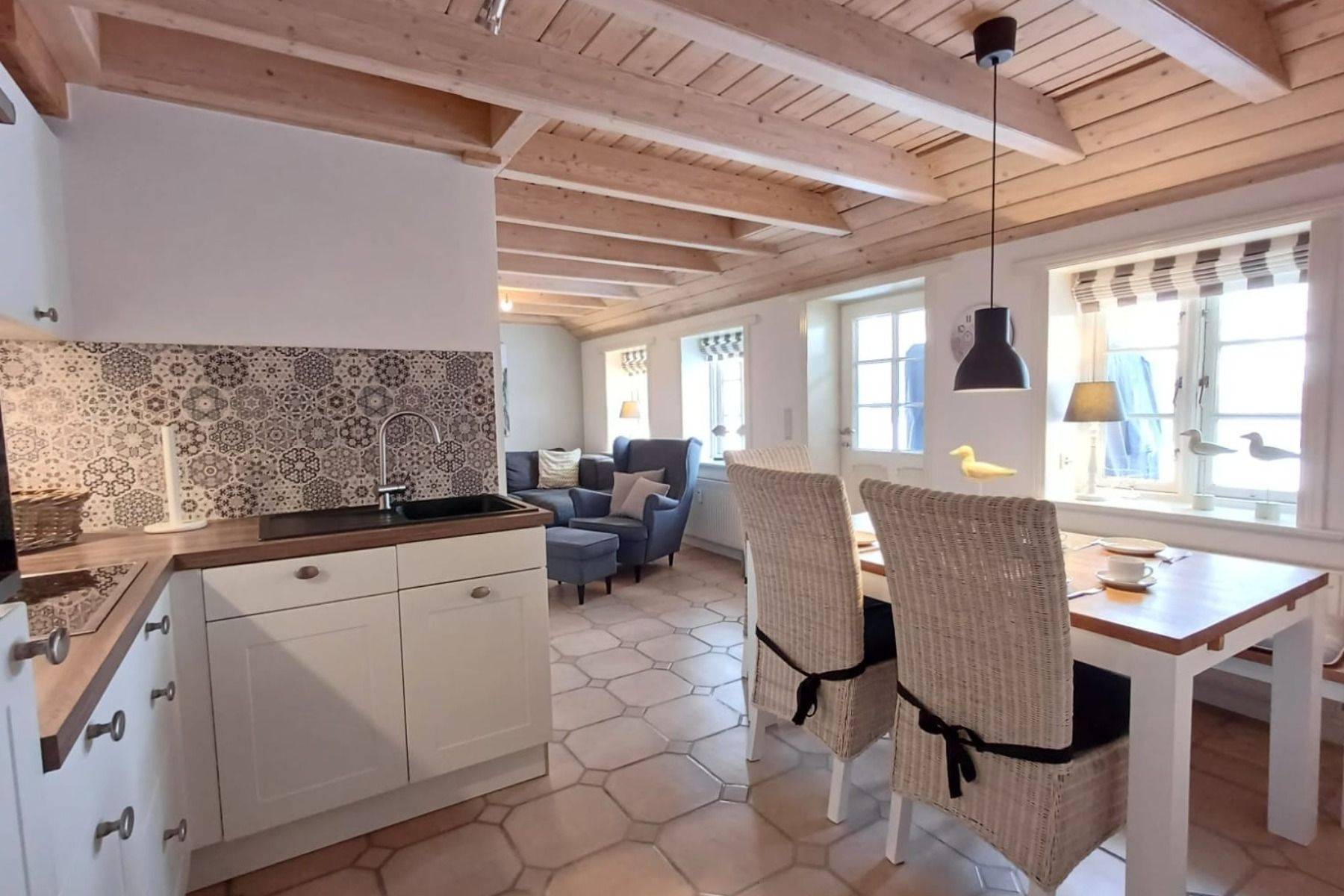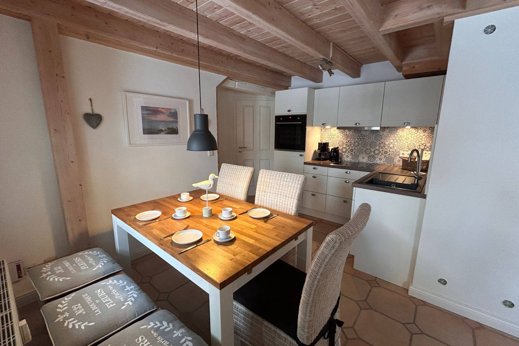 Auf einer Ebene bietet die Erdgeschosswohnung Platz für bis zu vier Personen und ein Baby. Der großzügige Wohn- und Essbereich bildet das Herz der Wohnung: hell, gemütlich und perfekt für gemeinsame Mahlzeiten, Spieleabende oder entspannte Stunden nach einem Tag an der frischen Nordseeluft. Die modern ausgestattete Küche lässt keine Wünsche offen.